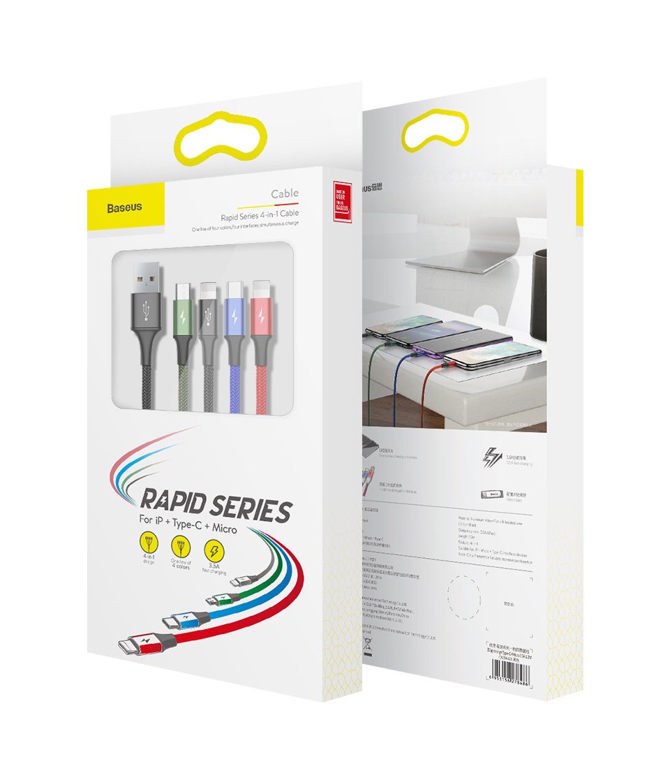 - Cáp sạc đa năng 4 trong 1 cho điện thoại/ I-pad CA1T4 3.5A Baseus Rapid Series 4 in 1 cable (3.5A, 1.2M, for I-phone, Type-C, Micro, Fast charge 4 in 1 Cable) là phiên bản nâng cấp của cáp sạc 3 đầu Baseus Rapid series 3 in 1 đang rất được người dùng ưa chuộng. Sản phẩm được bổ sung thêm 1 đầu kết nối cho phép bạn có thể kết nối với 4 thiết bị cùng lúc cỉ với 1 sợi cáp duy nhất.
