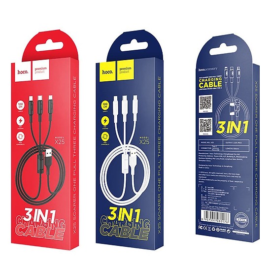Cáp Sạc Hoco X25 - 3 Đầu (Lighting, Micro, Type-C) + Tặng Kèm Ghế Đỡ Điện Thoại Chữ O - Hàng Chính Hãng