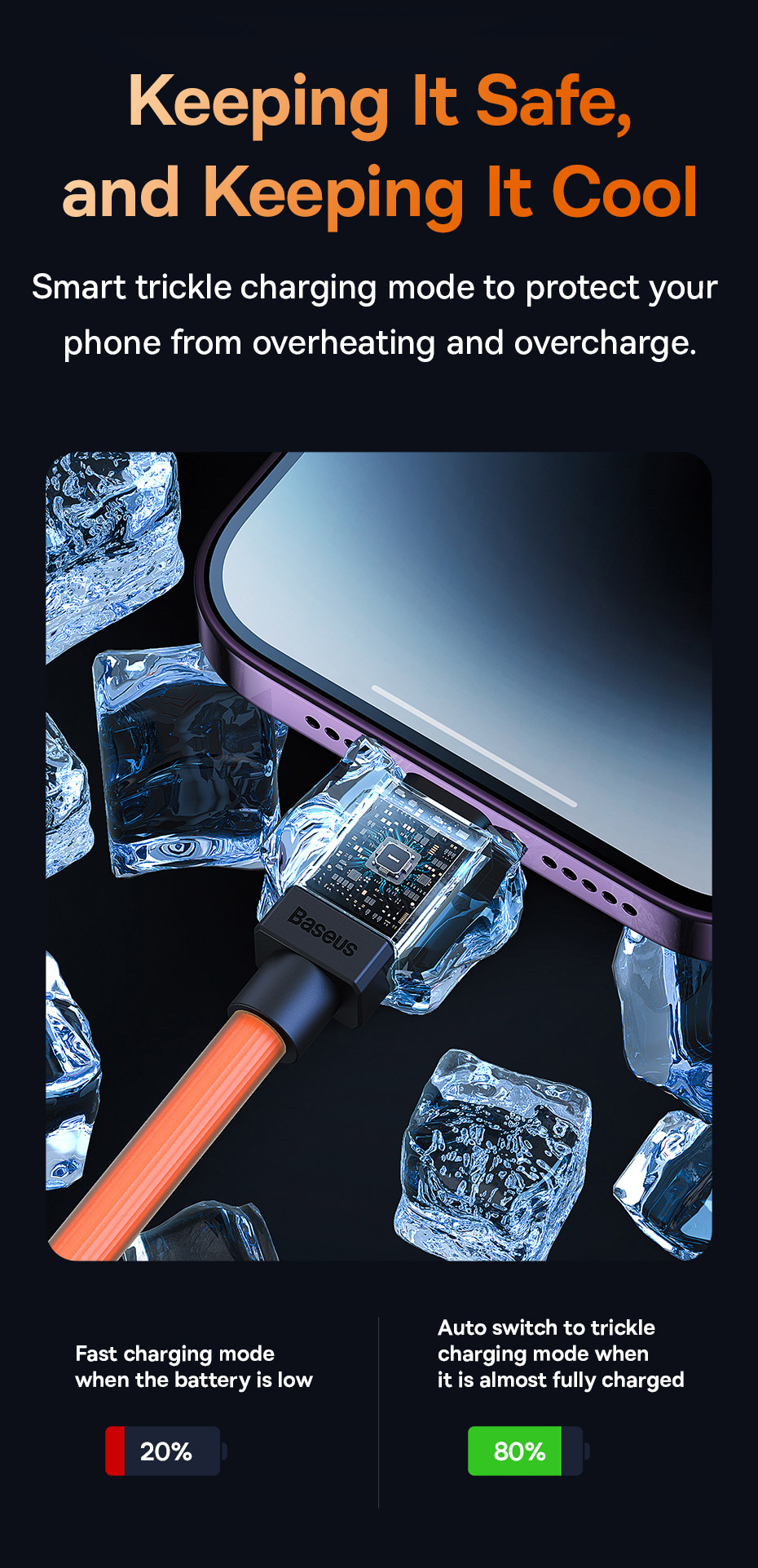 Một trong những tính năng nổi bật của sản phẩm này là công nghệ điều khiển nhiệt thông minh, giúp giảm nhiệt độ của cáp sạc khi sạc các thiết bị của bạn. Cụ thể khi điện thoại còn dưới 50% cáp sẽ sạc ở công suất cao nhất và khi điện thoại sạc đến 80% sẽ chuyển sang sạc nhỏ giọt giúp bảo vệ tuổi thọ pin của thiết bị.