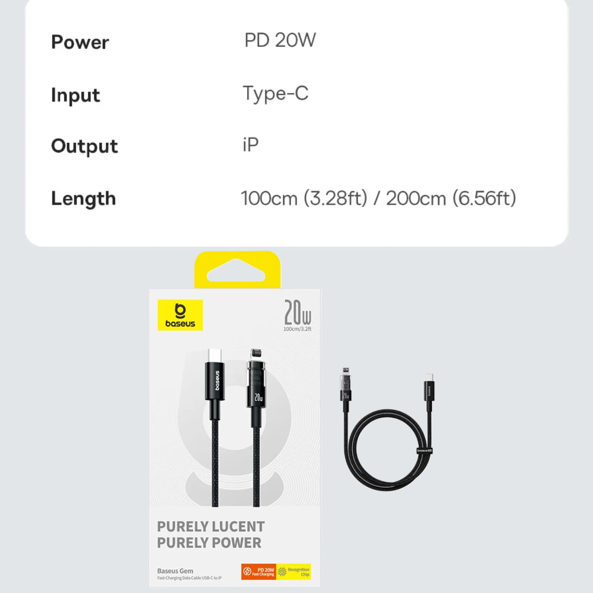 - Với khả năng hỗ trợ sạc nhanh 20W, cáp sạc Type C to Light-ning Baseus Gem giúp rút ngắn thời gian sạc cho các thiết bị Ap-ple như iP, i-Pad, và Air-Pods. Nếu bạn đang sở hữu một chiếc iP 12 hoặc mới hơn, cáp này sẽ cung cấp khả năng sạc nhanh hơn rất nhiều so với những cáp sạc thông thường, giúp bạn tiết kiệm thời gian và luôn sẵn sàng cho công việc.