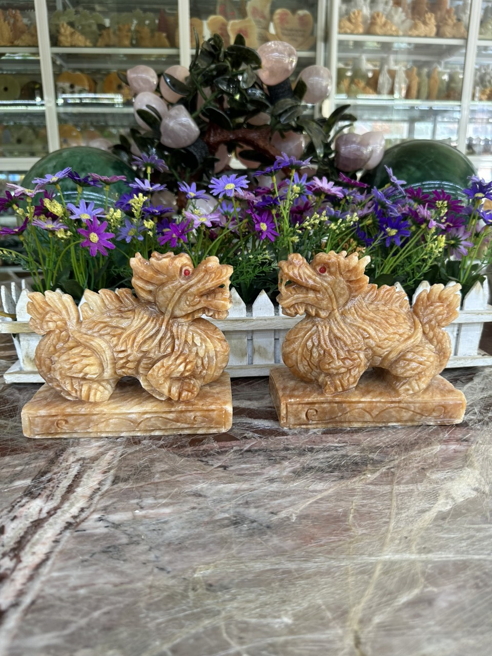 Hợp mệnh Thổ - Kim Chất liệu: Đá cẩm thạch vàng cà rốt Kích thước: Dài 15 cm X Rộng 6 cm x Cao 12,5 cm Khối lượng: 3,2 kg / cặp Ý nghĩa Tỳ