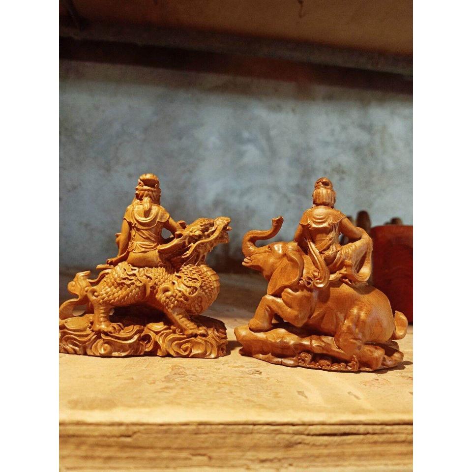 Cặp tượng phật văn thù và phổ hiền cưỡi linh thú cao 15cm gỗ bách xanh