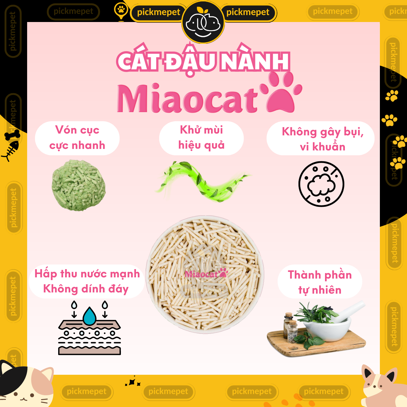 Cát vệ sinh cho mèo thân thiện với môi trường, làm từ bã đậu nành và bột ngô kết hợp cùng chất khử mùi tự nhiên Công thức độc quyền: Cát đậu nành Miao được