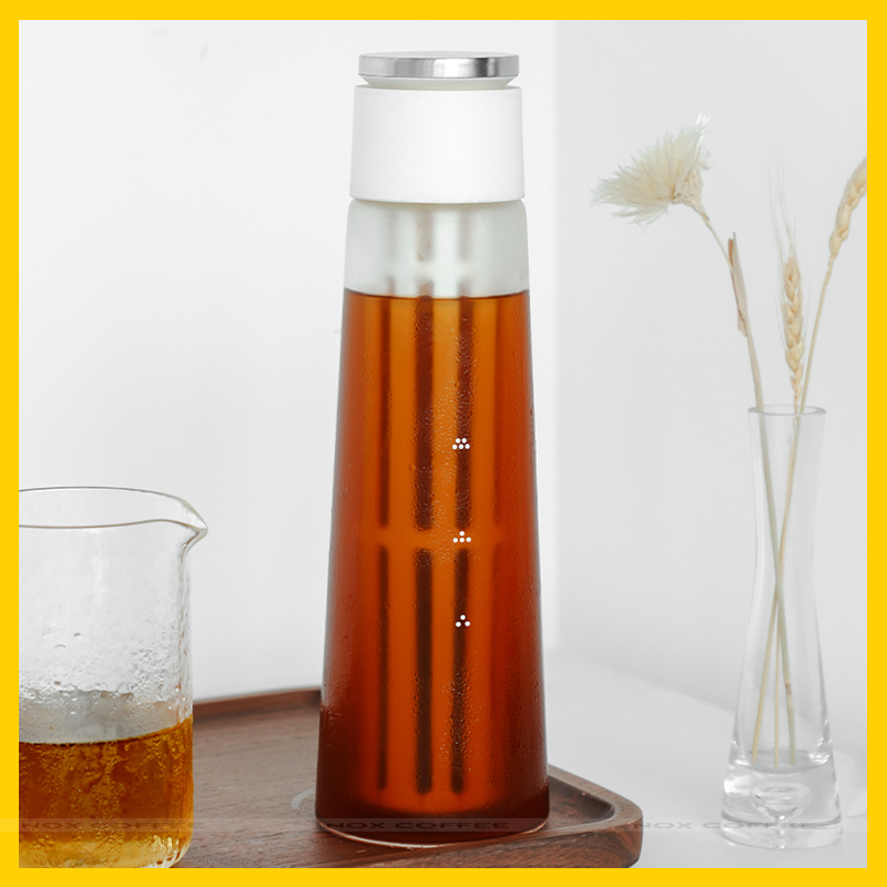 Bình được làm từ thuỷ tinh chất lượng cao, trên thân có in mức vạch đo giúp dễ dàng hơn trong việc kiểm soát tỷ lệ. Điểm nối bậc của bình là được tích hợp van chống tràn silicone hai lớp, ngoài việc tạo kín khí ngăn chặn sự xâm nhập từ môi trường bên ngoại thì bình dù trong tư thế đứng hay nằm cũng không bị đổ nước ra ngoài. Ngoài ra với thiết kế lõi lọc dài đến tận đáy bình nên bạn có thể dễ dàng ủ cold brew với lượng cà phê ít chỉ từ 30g