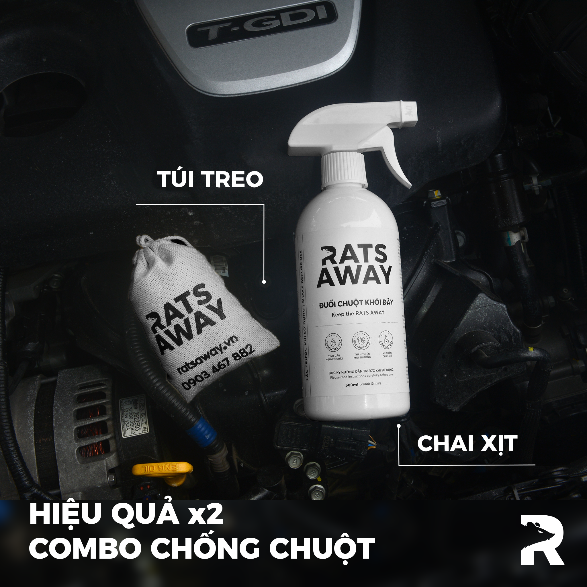 Sau khi treo túi, mỗi tuần 1-2 lần, sử dụng Chai xịt RATS AWAY để xịt vào toàn bộ khoang xe và xịt vào mỗi túi 5-6 lần để tăng khả năng khuếch tán mùi và lưu hương của túi treo lẫn dung dịch trong chai xịt