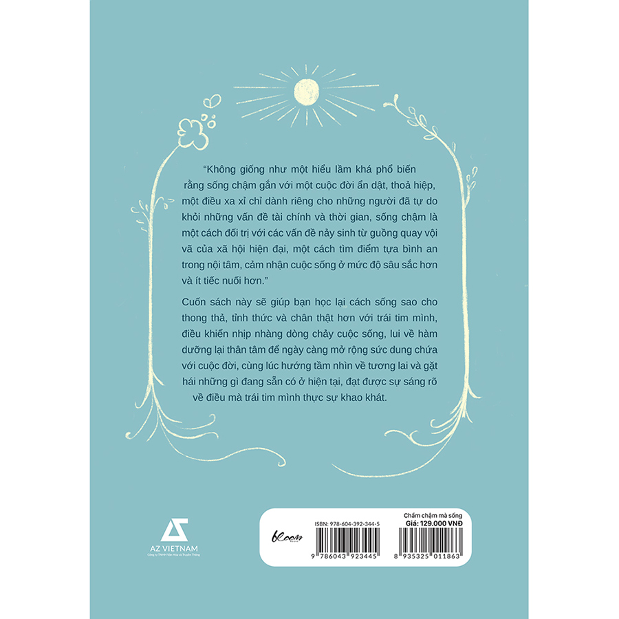Đây là một cuốn sách toàn diện về thực hành sống chậm, bao gồm những câu chuyện về những con người sống chậm thực thụ, cùng các phương pháp hiệu quả và gây hứng thú đã được chứng minh qua chính các trải nghiệm của những người mà tác giả đã từng khai vấn và giảng dạy. Cuốn sách này sẽ giúp ta học lại cách sống sao cho thong thả, tỉnh thức và chân thật hơn với trái tim mình, học cách điều khiển nhịp nhàng dòng chảy cuộc sống, lui về hàm dưỡng lại thân tâm để ngày càng mở rộng sức dung chứa với cuộc đời, đạt được sự sáng rõ về điều mà trái tim mình thực sự khao khát, và rồi nhận ra bên cạnh việc hướng tầm nhìn về tương lai, ta luôn có thể đón nhận những gì đang sẵn có ở hiện tại.