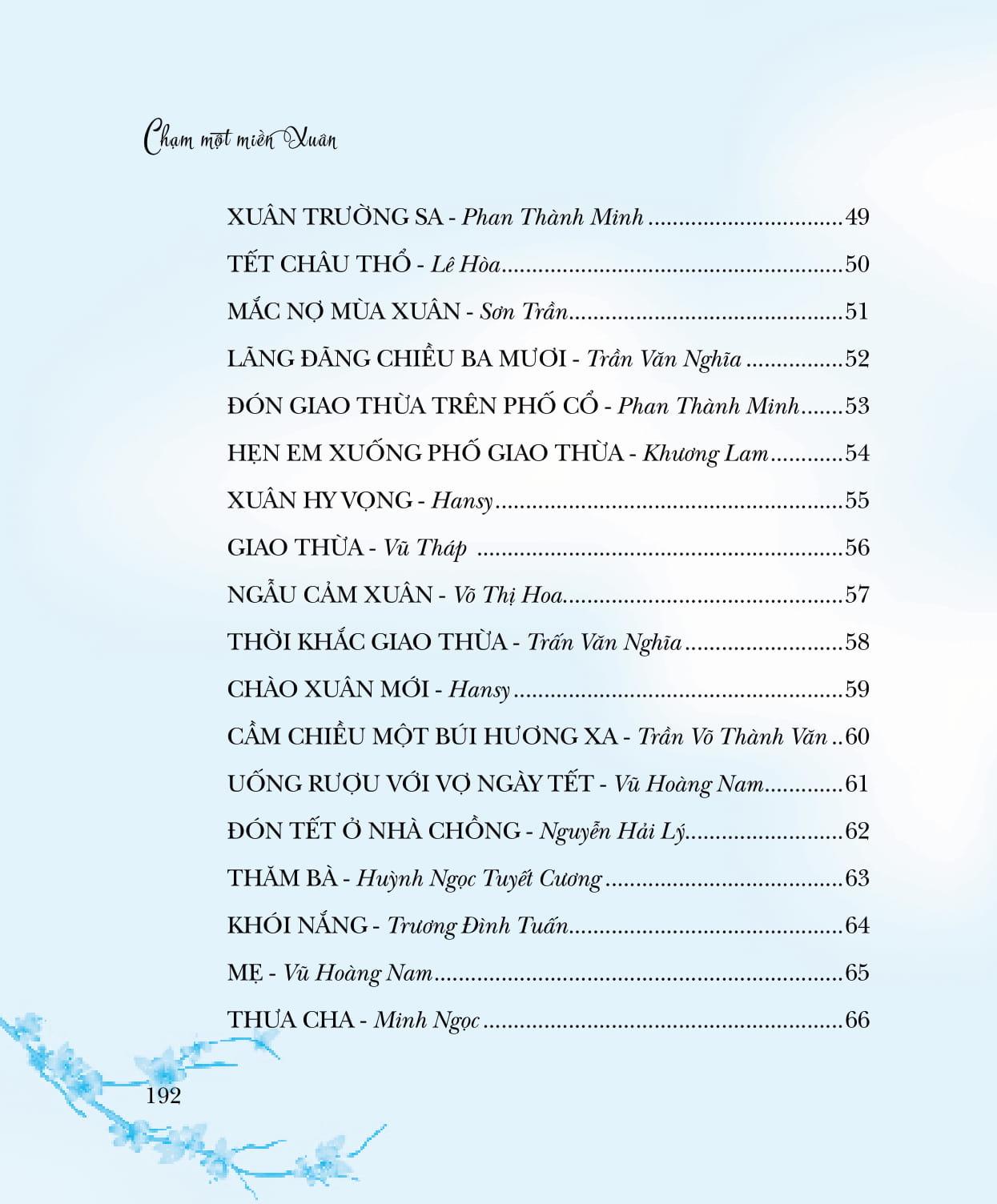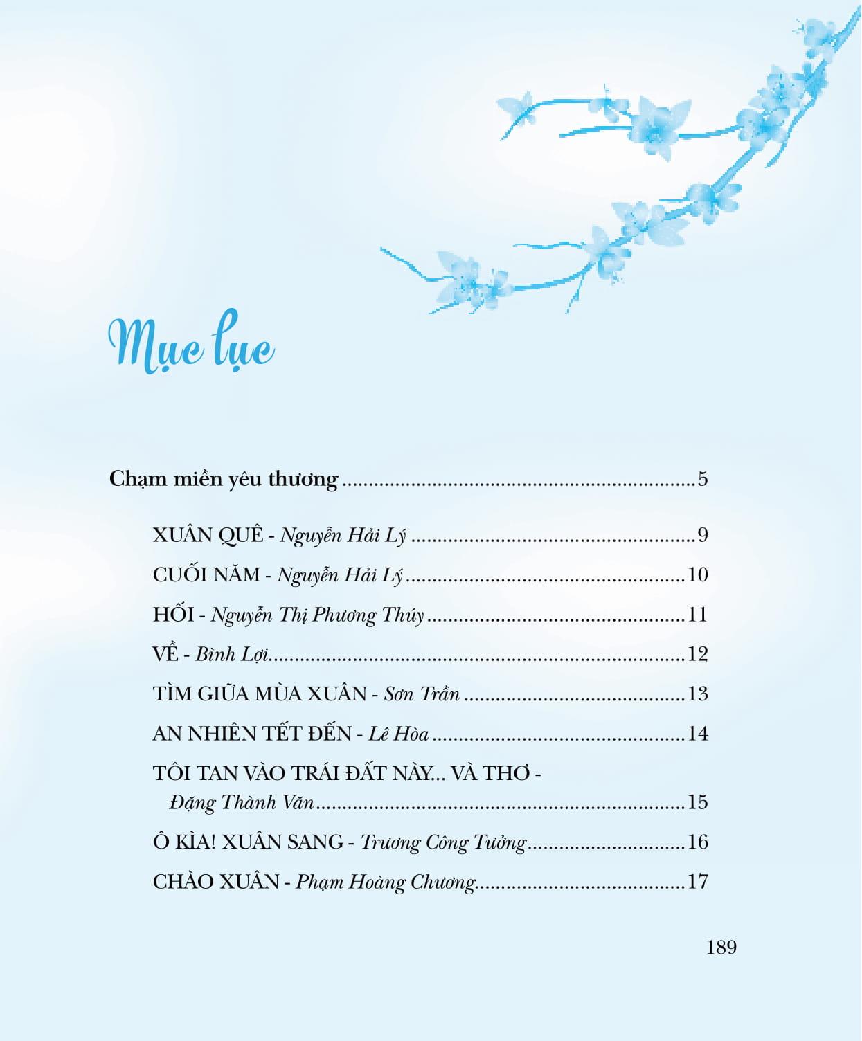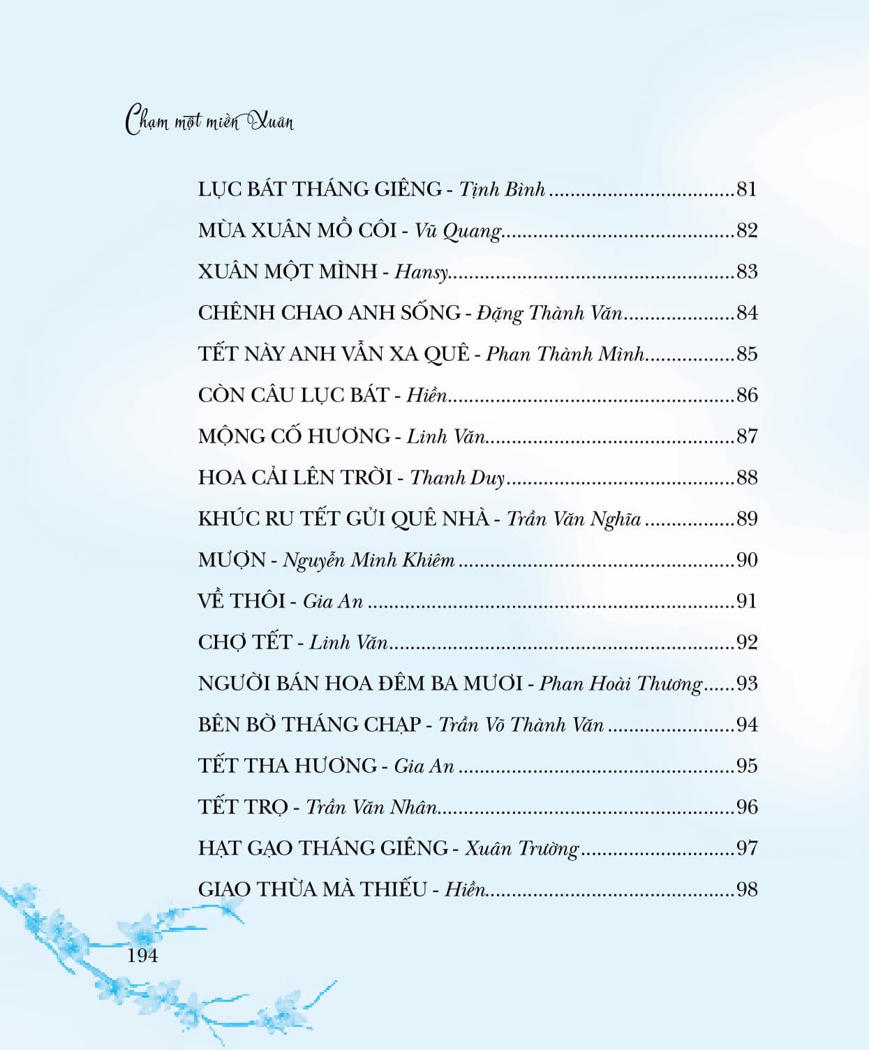 Cuộc thi thơ Lục bát Tết, lần đầu tiên do Saigon Books tổ chức, đặc biệt đáng nhớ vì diễn ra vào những ngày tháng Chạp, giáp Tết Đinh Dậu (2017). Khi những dòng người ngược xuôi, náo nhiệt trở lại quê nhà vui Tết thì Lục bát Tết cũng lần lượt đổ về hộp thư điện tử của chúng tôi. Lục bát, đương nhiên là phải có quy định niêm luật, nhưng vượt lên những niêm luật mang tính kỹ thuật, đó chính là QUY LUẬT TÌNH CẢM, là nhịp điệu thương nhớ gieo mầm, nảy nở theo mùa màng. Chọn 158 tác phẩm của 50 tác giả vào Chung khảo cuộc thi Lục bát Tết để in trong tập sách này, chúng tôi xem đây như là món quà nhỏ gửi đến những bạn đọc, bạn viết yêu thơ. Và, cao hơn là yêu quê hương mình còn lận đận một nắng hai sương, còn trĩu nặng toan lo trên những bờ vai gầy guộc. Chạm một miền Xuân là chạm vào một miền cảm xúc mênh mang của bao người.