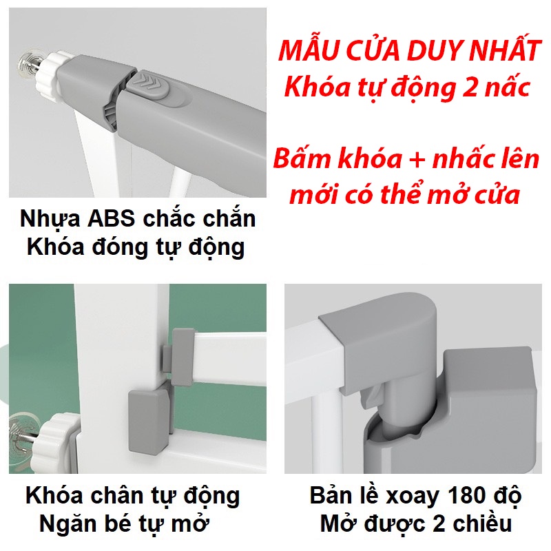 ĐẶC ĐIỂM THANH CỬA, CẦU THANG Kích thước linh hoạt từ 75-84cm Chiều cao tấm chặn 79cm Cửa có lò xo tự động đóng khi ra vào Thiết kế cố định 4 góc bằng