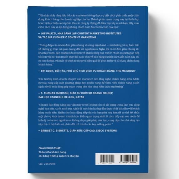 Công ty phát hành: RIOBook Tác giả: Adele Revella NXB: NXB Dân Trí Ngày phát hành: 2022 Số trang: 327 Giới thiệu sách: Cuốn sách “CHÂN DUNG THẬT - Thấu hiểu khách hàng chỉ bằng những cuộc trò chuyện” chia sẻ một phương pháp nghiên cứu chân dung khách hàng không tốn nhiều chi phí, không cần khảo sát trên quy mô lớn nhưng lại đem đến những hiểu biết sâu sắc và chính xác hơn về quyết định mua hàng. Phương pháp này đặc biệt phù hợp cho marketer trong ngành hàng B2C có giá trị cao (giáo dục, y tế, tour du lịch, bất động sản, ô tô, chứng khoán,) và các ngành hàng B2B. Nếu bạn là một marketer luôn phải ngồi bàn giấy để cho ra những giả thuyết về chân dung khách hàng, hay thường cảm thấy nghi ngờ những hiểu biết về khách hàng của mình, cuốn sách CHÂN DUNG THẬT sẽ giúp bạn lắng nghe và tìm ra điều khách hàng thực sự mong muốn. Dựa trên quan điểm chân dung phải được phát triển từ những câu chuyện gần gũi và thực tế với cuộc sống của khách hàng, cuốn sách hướng dẫn người đọc thực hiện các cuộc phỏng vấn cá nhân một cách tự nhiên, nhằm khuyến khích khách hàng chia sẻ câu chuyện của họ từ đó có thể thu được những insight đáng ngạc nhiên về quá trình ra quyết định mua: kỳ vọng và mối quan tâm, thái độ và động lực, hệ tư tưởng, quá trình so sánh sản phẩm của bạn và đối thủ cạnh tranh, những người ảnh hưởng đến quyết định mua hàng, Đặc biệt, chỉ thông qua 8 - 10 cuộc trò chuyện, phương pháp này đã có thể làm sáng tỏ bức chân dung đầy đủ về người mua hàng. Vì thế, việc nghiên cứu chân dung khách hàng không còn tốn nhiều thời gian, nhân sự và chi phí - phù hợp cho cả những doanh nghiệp có nguồn lực giới hạn. Cuốn sách “CHÂN DUNG THẬT - Thấu hiểu khách hàng chỉ bằng những cuộc trò chuyện” sẽ hé lộ về phương pháp này trong 3 phần: PHẦN 1: Thấu hiểu nghệ thuật chân dung khách hàng Khám phá 5 vòng insight của người mua khi cân nhắc các sản phẩm có giá trị cao. Tìm hiểu cách các câu chuyện tiết lộ về tâm lý và hành vi khách hàng. PHẦN 2: Phỏng vấn khai thác insight mua hàng Các bước thực hiện phỏng vấn: lên kế hoạch, lựa chọn đối tượng phỏng vấn, những điều nên hỏi, cách dẫn dắt cuộc phỏng vấn và phân tích insight từ các câu trả lời. PHẦN 3: Hoạch định chiến lược để thành công hơn trong kinh doanh Sử dụng chân dung khách hàng để cải thiện hoạt động marketing và kinh doanh, tránh lãng phí insight vì những lỗi sai trong thực thi. Bạn sẽ tiếp tục đặt giả thuyết về khách hàng của mình hay thực sự lắng nghe họ trong đời thực? Hãy để những chỉ dẫn trong “CHÂN DUNG THẬT - Thấu hiểu khách hàng chỉ bằng những cuộc trò chuyện” giúp bạn làm sáng tỏ insight giấu kín và động lực ra quyết định mua của khách hàng! Gooda tin rằng cuốn sách sẽ mang lại kiến thức thật bổ ích cùng những trải nghiệm thật tuyệt vời, hy vọng đây sẽ là 1 cuốn sách quý trên kệ sách của bạn! QUYỀN LỢI KHÁCH HÀNG KHI MUA SÁCH TẠI SHOP GOODA THƯ VIỆN SÁCH QUÝ: