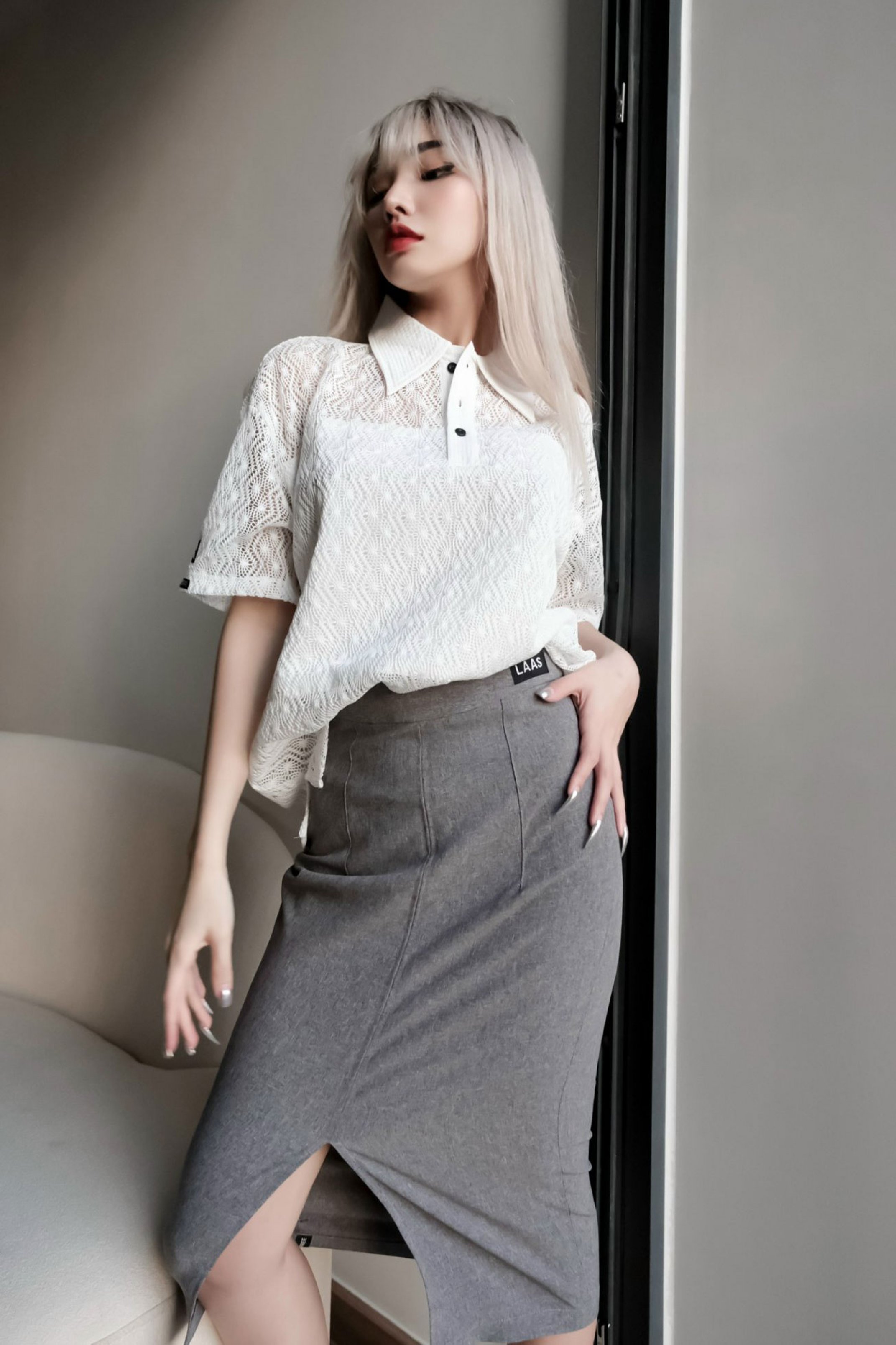 Set bộ - Áo kiểu chân váy tay hến hoa 3D - Xám trắng