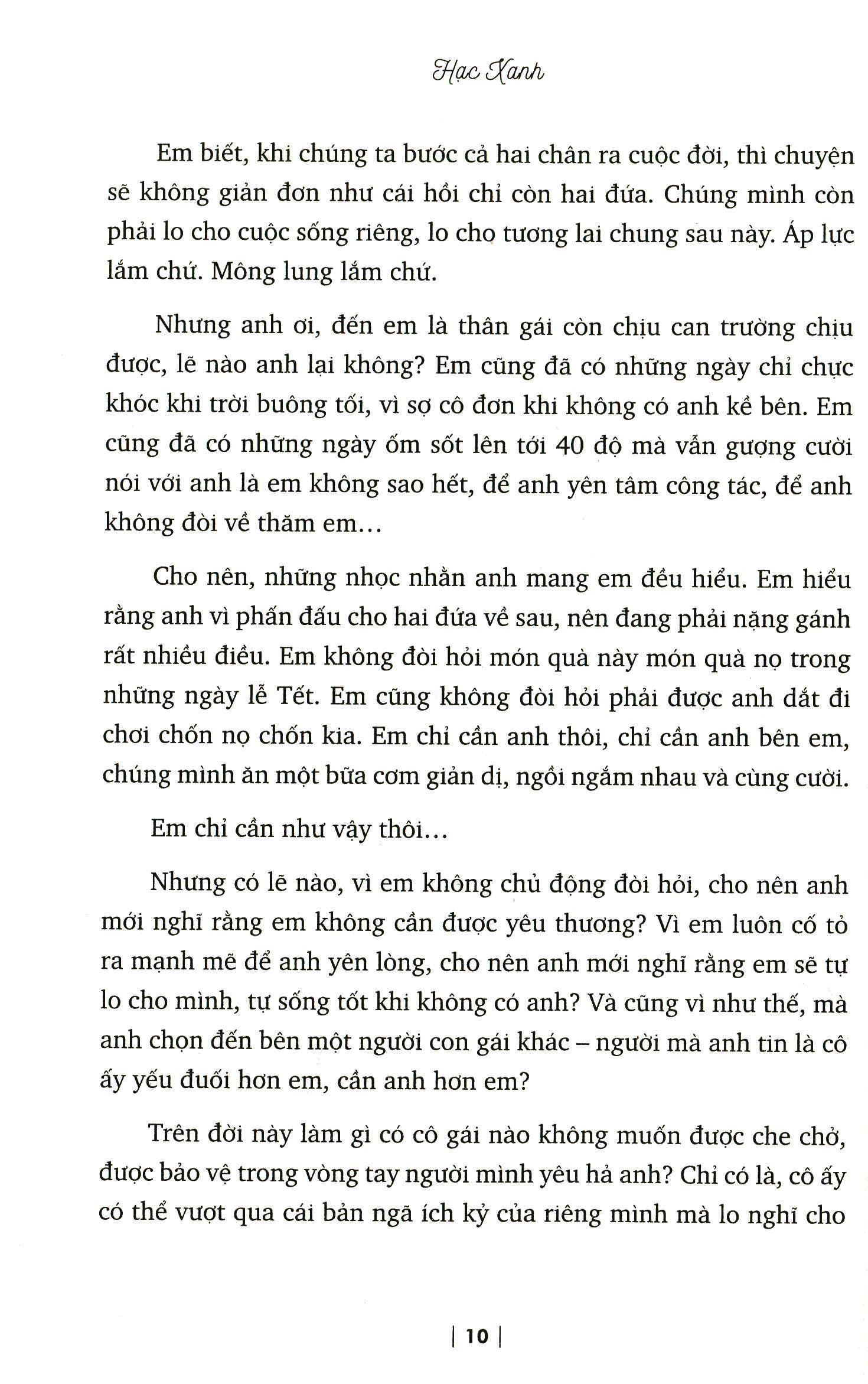 Được viết với giọng văn nhẹ nhàng, nữ tính, đầy chất tâm tình nhưng không quá ủy mị, ướt át, tập sách có nhiều trang viết tựa như những lá thư tình của một cô gái viết gửi tặng chàng trai mình đã yêu, hoặc gửi tặng đến có thể là bất cứ ai trong chúng ta, những người trẻ vẫn dành cho tình yêu một vị trí quan trọng trong đời.