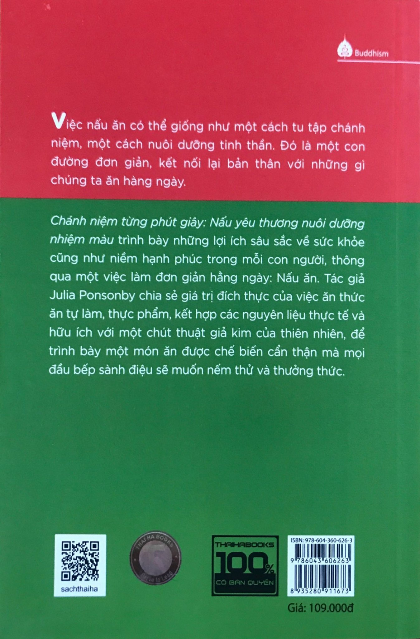 Chánh niệm từng phút giây: Nấu yêu thương nuôi dưỡng nhiệm mầu   Công ty phát hành: Thái Hà Tác giả: Julia Ponsonby Nhà xuất bản: Lao động Khổ: 13 x 18,5cm  Số trang: 160 trang Năm xuất bản: 2022 [ThaiHaBooks] Từ lịch sử thú vị của việc nấu ăn, cách chế biến và phong vị địa phương của những cách nấu, cuốn sách đem đến cho người đọc một góc nhìn mới, thảnh thơi và chậm rãi hơn, giúp hoạt động nấu ăn cũng đem lại cho người thực hiện một tâm thế nhẹ nhàng, thư giãn và sâu sắc hơn. Chánh niệm là sống trọn vẹn trong từng khoảnh khắc và kéo dài khoảnh khắc đó vào miền vĩnh cửu của linh hồn. Kết nối một cách đầy ý nghĩa với lịch sử ẩm thực của con người có thể đem lại cảm giác về sự nhận thức mở rộng này. Đầu bếp là những người thực hành và cảm nhận từ thực tế – nhưng không hẳn là những người có nhiều thời gian để thiền định hay nhận biết hơi thở. Chánh niệm trong nấu ăn có thể là một nguyên liệu quan trọng hơn bất cứ gia vị nào – ví dụ như muối. Những bếp trưởng thành công nhất là những người có sự tỉnh thức trong việc nấu nướng, nhưng họ không gọi hành động đó của bản thân là việc làm có chánh niệm. Nhưng dù hoạt động nấu ăn có thu hút được những người biết cảm nhận thực tế hay không, hoặc là có những người muốn trở nên thực tế thông qua việc nấu nướng, thì đó cũng không phải là vấn đề. Có một thực tế là, những lúc nấu nướng là cơ hội lý tưởng để chúng ta thoát khỏi cái bẫy về niềm hạnh phúc do tâm trí mình đặt ra; và cho phép chúng ta thêm vào trong mình những điều tích cực. Nhiều yếu tố ảnh hưởng đến thứ mà ta nấu; và cũng chính việc nấu nướng cũng tác động tới nhiều điều. Để tâm trí được gợn những suy nghĩ, lưu ý tới mọi điều như vậy sẽ mở ra một cái nhìn hoàn toàn mới, thay vì chỉ nhìn thấy một quá trình nấu nướng duy nhất. Làm như vậy, tâm trí sẽ làm phong phú thêm cho khoảnh khắc của chúng ta và tạo dựng một nhận thức toàn diện về những gì bản thân đang làm. Cuốn sách nhẹ nhàng này sẽ giúp bạn hạnh phúc hơn ngay cả khi bạn đang nấu nướng. Khi thay đổi góc nhìn, tâm thế của chúng ta cũng sẽ thay đổi theo. Đây là cuốn sách nằm trong bộ “Chánh niệm từng phút giây”. Cuốn sách gợi mở những suy nghĩ mới về nấu ăn – một trong những hoạt động thú vị nhất mà chúng ta thực hiện mỗi ngày – như một cách tiếp cận có “chánh niệm” hơn với cuộc sống. Mục lục: Lời giới thiệu Thức ăn chậm trong một thế giới nhanh  Một lịch sử ẩm thực sâu sắc Kết nối với chu kỳ của tự nhiên Hành trình Đóng gói và mở gói Nghệ thuật nuôi dưỡng Trái tim của mọi ngôi nhà Cảm nhận qua mọi giác quan Con công ở trong bếp Ăn uống lành mạnh Linh hoạt Lễ kỷ niệm Liệu chúng ta có trở thành những gì chúng ta ăn? Nghĩ về gluten và đường  Bước trên con đường vững chắc của nông nghiệp hữu cơ Nêm gia vị theo lí trí Ăn trong chánh niệm Tiết lộ về siêu thực phẩm Cắt giảm đồ dùng thừa thãi Mài sắc con dao và cuộc sống Kiên nhẫn, nguyên liệu quan trọng nhất Suy nghĩ về lãng phí thức ăn Nhìn thấy sự toàn hảo trong cái bất toàn Đón nhận lòng biết ơn Niềm vui của nấu ăn Bày biện: Trau dồi sự giản đơn    Trích đoạn sách: Tua nhanh nhiều nghìn năm để đến thế kỷ gần nhất, một nền ẩm thực mới đã lan rộng trên sải cánh của toàn cầu hóa. Toàn cầu hóa cho phép con người ở khắp nơi trên thế giới kết nối với những bữa ăn truyền thống yêu thích từ mọi ngõ ngách của Trái đất – khái niệm về chế độ ăn uống dựa trên các nguyên liệu có nguồn gốc địa phương và mang tính tập tục giờ đây bị đảo ngược, và những món ăn đặc trưng vùng miền bị biến thành món hàng quốc tế. Chúng ta tìm thấy sushi, pasta, pizza và cà ri trong những cái “tổ” mọi quốc gia. Ngày xưa, những “quả trứng tu hú” như vậy được coi là “đặc sản” địa phương, hầu như chỉ tồn tại ở các quốc gia xuất xứ của chúng. Ngày nay, những nơi bị văn hóa kiểu phương Tây chạm vào, thì bất kỳ ai cũng có thể thưởng thức chúng; những dòng mạch chung được tạo nên, liên kết những con người riêng biệt. Khi chúng ta sử dụng những tạo vật của các mùa, chúng ta không chỉ tham gia vào một quy trình hay phong cách nấu ăn: Chúng ta đang tham gia vào một cách sống và mở rộng tầm mắt tới các chu kỳ của vũ trụ quanh mình. Chúng ta đang vận hành đồng bộ với những chu kỳ của tự nhiên: Niềm vui song hành cùng sự hồi sinh khi mùa xuân đến; và cảm giác không trọn vẹn, đủ đầy tương ứng với cú đấm của bóng tối vào mùa đông. Ngay khi không kết nối món ăn của mình với sản vật địa phương và theo mùa, chúng ta sẽ đánh mất điều gì đó. Bằng việc tiến vào một cái siêu thị – nơi mọi thứ mà mình nấu và ăn được chiếu sáng bởi thứ ánh sáng đèn điện chói cha
