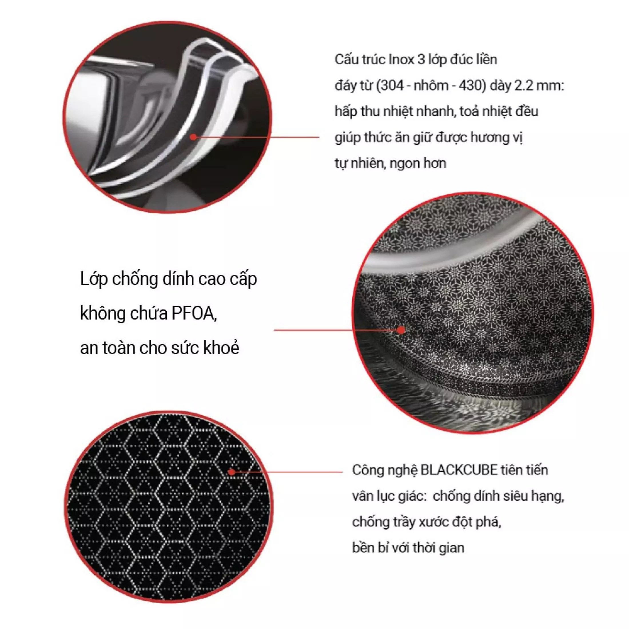 - Thân đa lớp inox với BLACKCUBE mới nhất Hàn Quốc, Kỹ thuật khắc Blackcube tạo ra nhiều trụ nhỏ inox che chắn lớp chống dính nên chống trầy xước - Phủ chống dính Silkware của