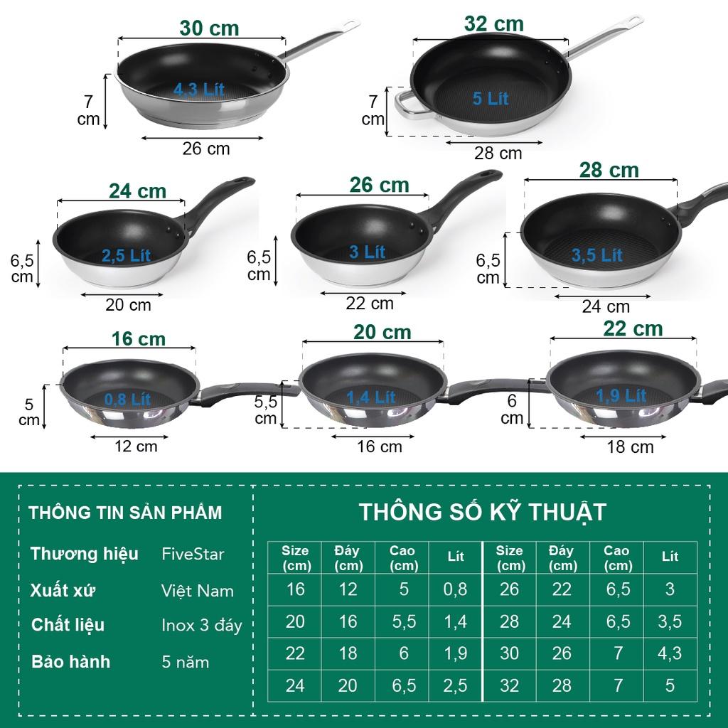️ Kích thước chảo: - Chảo 16cm: 16X5cm - Chảo 20cm: 20x5,5cm - Chảo 24cm: 24x6cm - Chảo 26cm: 26x6,5cm - Chảo 28cm: 28x7cm Đặc điểm nổi bật - Công nghệ chống dính Nano Titanium