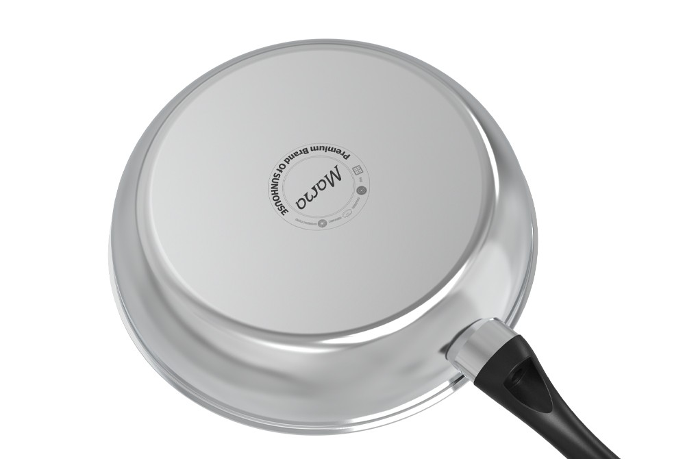Đáy inox 430 còn giúp bạn sử dụng chảo Sunhouse Mama DE20M hiệu quả trên mọi loại bếp như bếp từ, bếp hồng ngoại, bếp gas… Cấu tạo đáy liền thân giúp chống cong vênh hay phồng đáy, chống bong đáy.