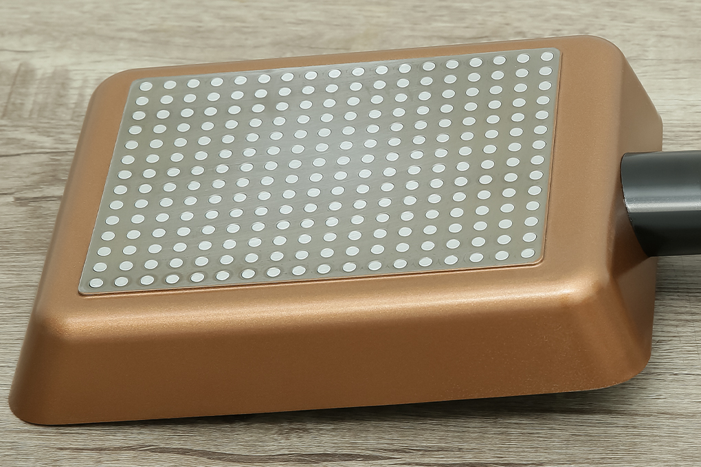 Làm bằng thép từ tính kết hợp lõi nhôm dày 6mm Lòng chảo được phủ lớp chống dính cao cấp Chảo được thiết kế kết cấu chống trơn trượt dưới đáy, rất an toàn khi