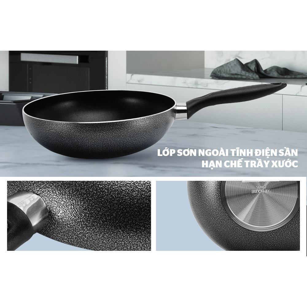 Chảo xào chống dính Mitomo Cooker King được làm từ thép hợp kim cao cấp, phủ lớp chống dính Dupont Teflon vân đá siêu bền và tuyệt đối an toàn cho sức khỏe, đáp