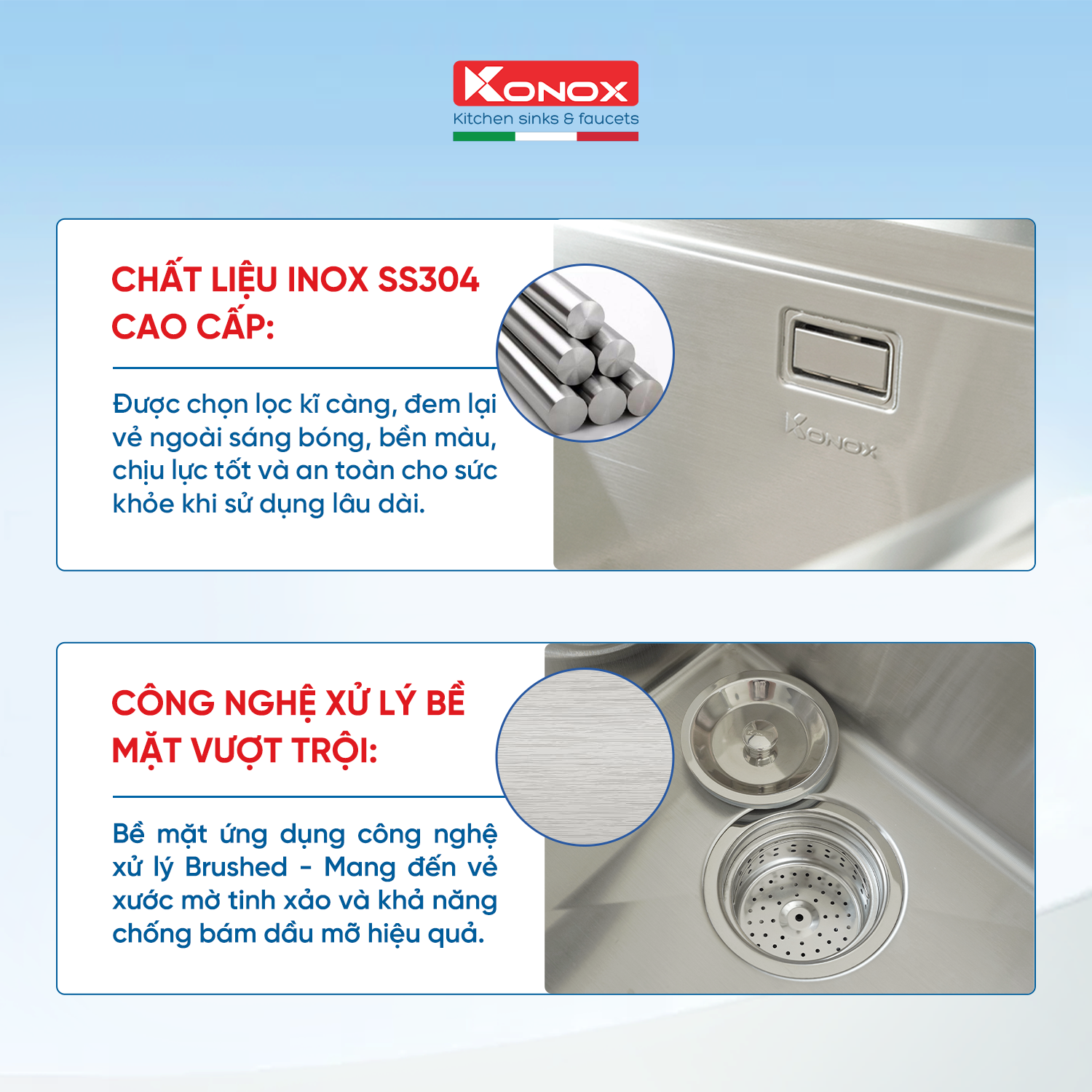 Thành phần chính: được làm từ inox không rỉ, chịu được nhiều nguồn nước. Sản xuất công nghệ của Ý với mẫu mã đa dạng, phong phú về chủng loại, kiểu dáng châu âu. Thiết