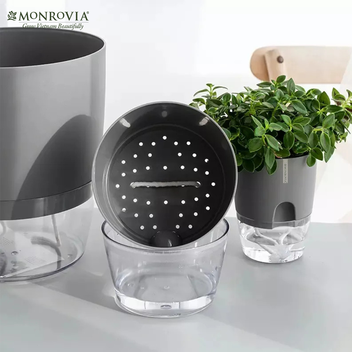 DOCNEEM XIN GIỚI THIỆU ĐẾN BẠN MÃ SẢN PHẨM - CHẬU TRỒNG CÂY TỰ TƯỚI THÔNG MINH MONROVIA H0 _ Chất liệu: PP cao cấp _ Cấu tạo: Chậu bao gồm hai lớp chậu *