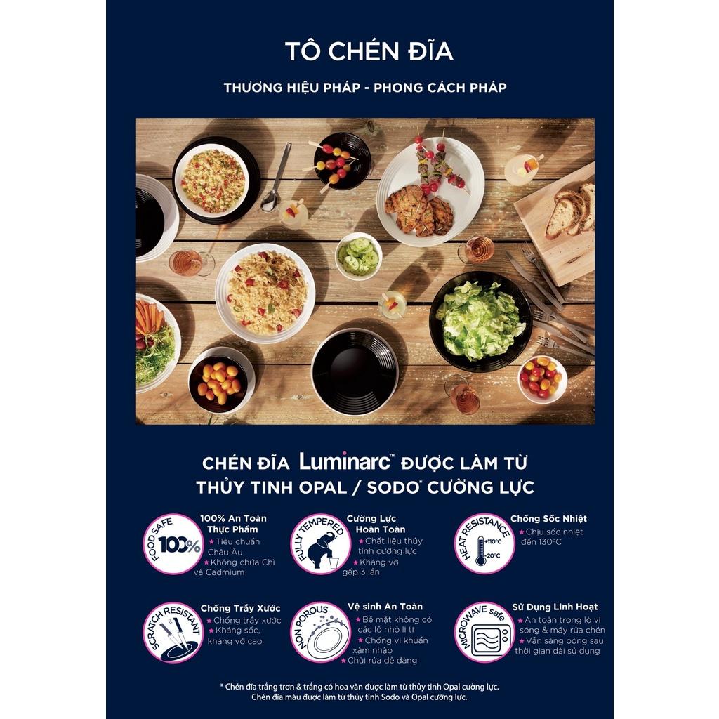 Một điểm nhấn đặc biệt trong bộ sưu tập chén dĩa bàn ăn của Luminarc, chính là dòng sản phẩm chén dĩa thủy tinh có màu - Diwali Black. Vẫn xuất phát từ thủy tinh gốm Opal, màu sắc đã được các nhà sản xuất pha trộn một cách khéo léo từ những giọt màu organic, thân thiện với sức khỏe người tiêu dùng. Mang lại tính thẩm mĩ cao khi phối hợp tone màu đen sang trọng, thanh lịch và tinh tế - phong cách nổi bật đến từ Pháp. Ngoài ra, màu đen cũng mang lại cho không gian bàn ăn nét cổ điển nhưng không kém phần nổi bật.