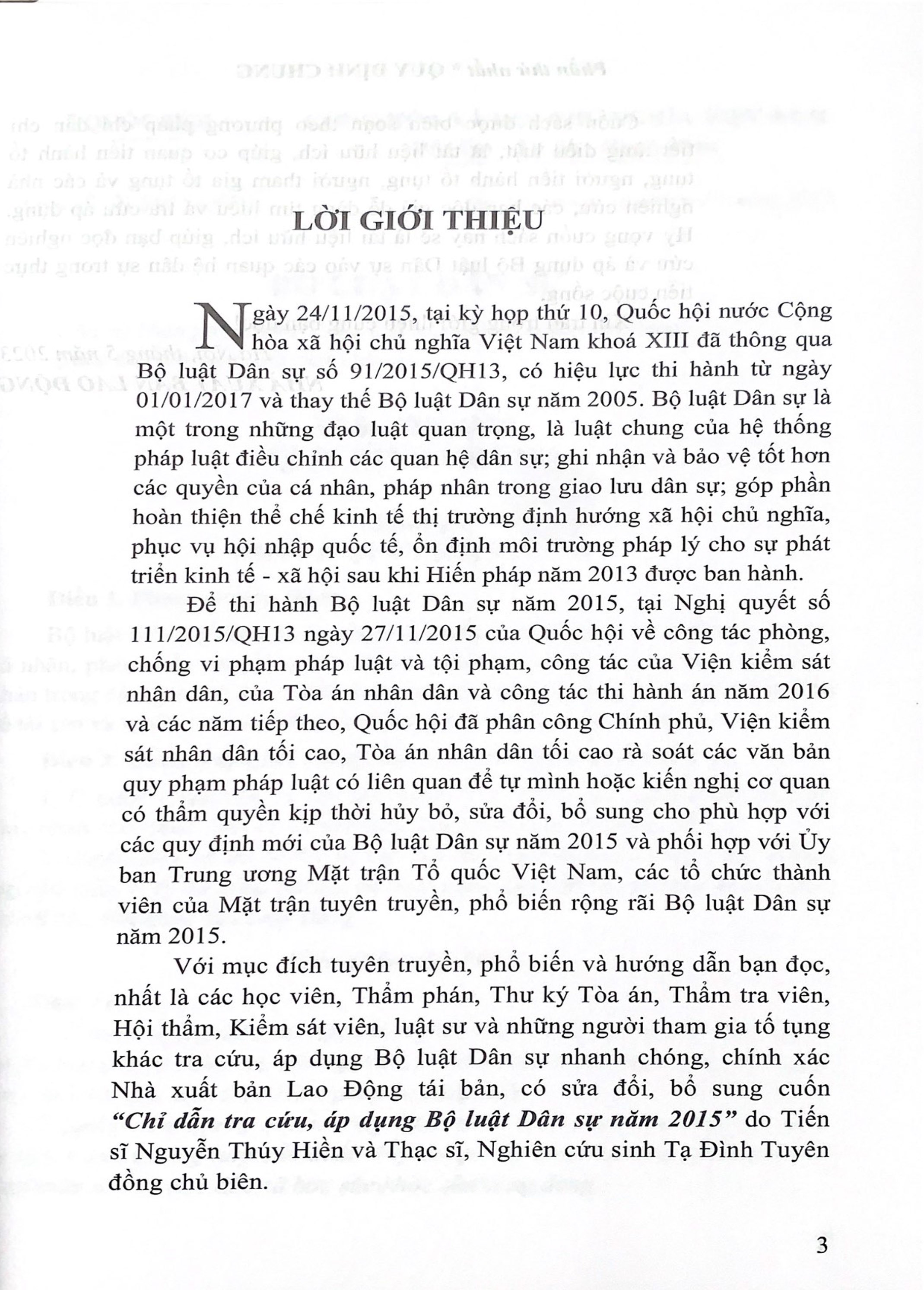 Với mục đích tuyên truyền, phổ biến và hướng dẫn bạn đọc, nhất là các học viên, Thẩm phán, Thư ký Tòa án, Thẩm tra viên, Hội thẩm, Kiểm sát viên, luật sư và những người tham gia tố tụng khác tra cứu, áp dụng Bộ luật Dân sự nhanh chóng, chính xác Nhà xuất bản Lao Động tái bản, có sửa đổi, bổ sung cuốn “Chỉ dẫn tra cứu, áp dụng Bộ luật Dân sự năm 2015” do Tiến sĩ Nguyễn Thúy Hiền và Thạc sĩ, Nghiên cứu sinh Tạ Đình Tuyên đồng chủ biên.