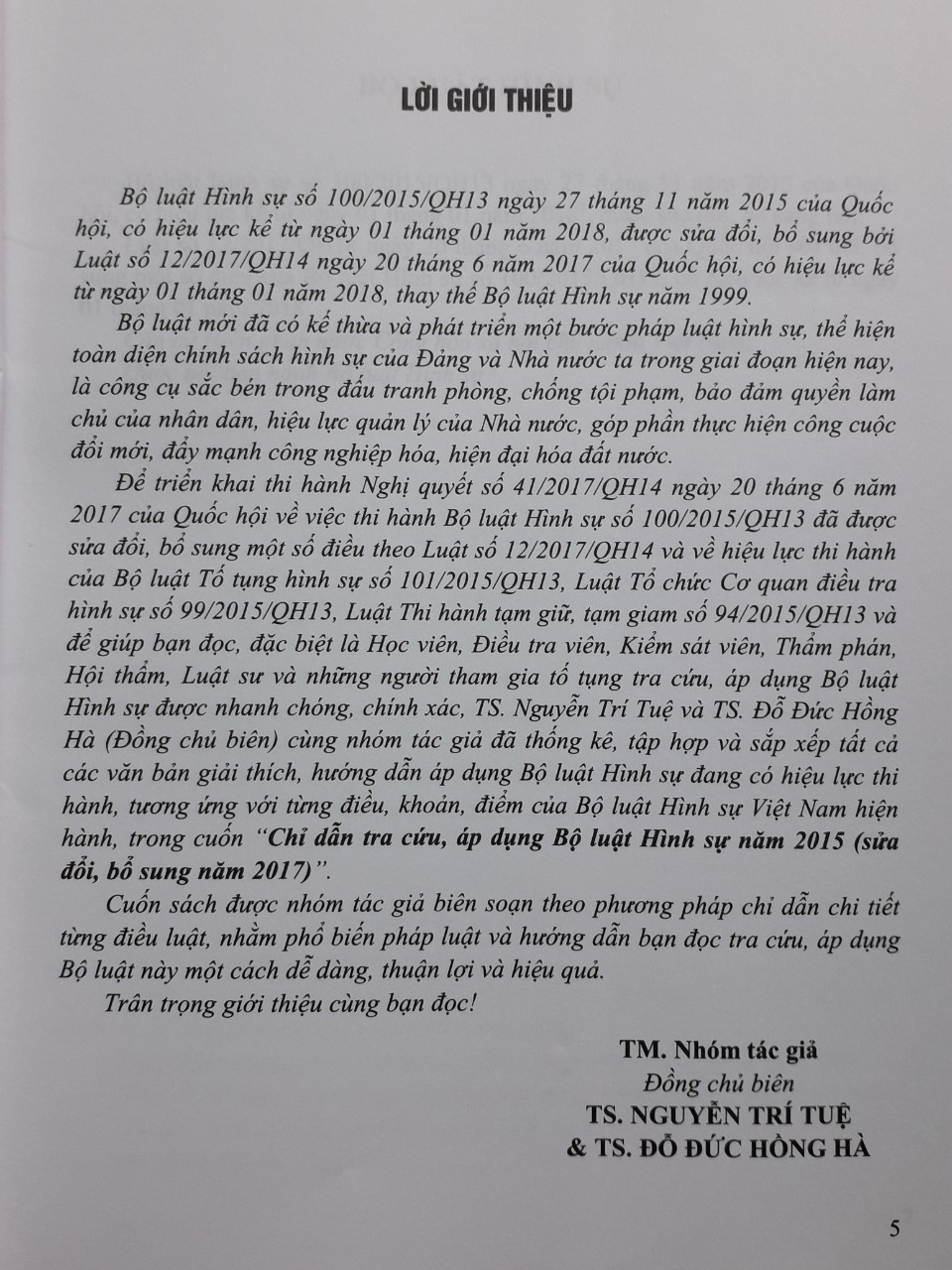 CHỈ DẪN TRA CỨU, ÁP DỤNG BỘ LUẬT HÌNH SỰ NĂM 2015 (SỬA ĐỔI, BỔ SUNG NĂM 2017)- Tái bản lần 1, có bổ sung Nhà xuất bản: Công An Nhân Dân Tác giả: Ts Nguyễn Trí Tuệ, Ts. Đỗ Đức Hồng Hà Xuất bản: 12/2019 Số trang: 1000 Cuốn Chỉ Dẫn Tra Cứu Áp Dụng Bộ Luật Hình Sự Năm 2015 Sửa Đổi, Bổ Sung Năm 2017 ( Tái Bản Lần Thứ Nhất, Có Chỉnh sửa, Bổ sung ) được tác giả: TS Nguyễn Trí Tuệ - TS Đỗ Đức Hồng Hà ( Đồng chủ biên ) cùng nhóm tác giả đã thống kê, tập hợp và sắp xếp tất cả các văn bản giải thích, hướng dẫn áp dụng Bộ luật Hình sự đang có hiệu lực thi hành, tương ứng với từng điều, khoản, điểm của Bộ luật Hình sự Việt Nam hiện hành.