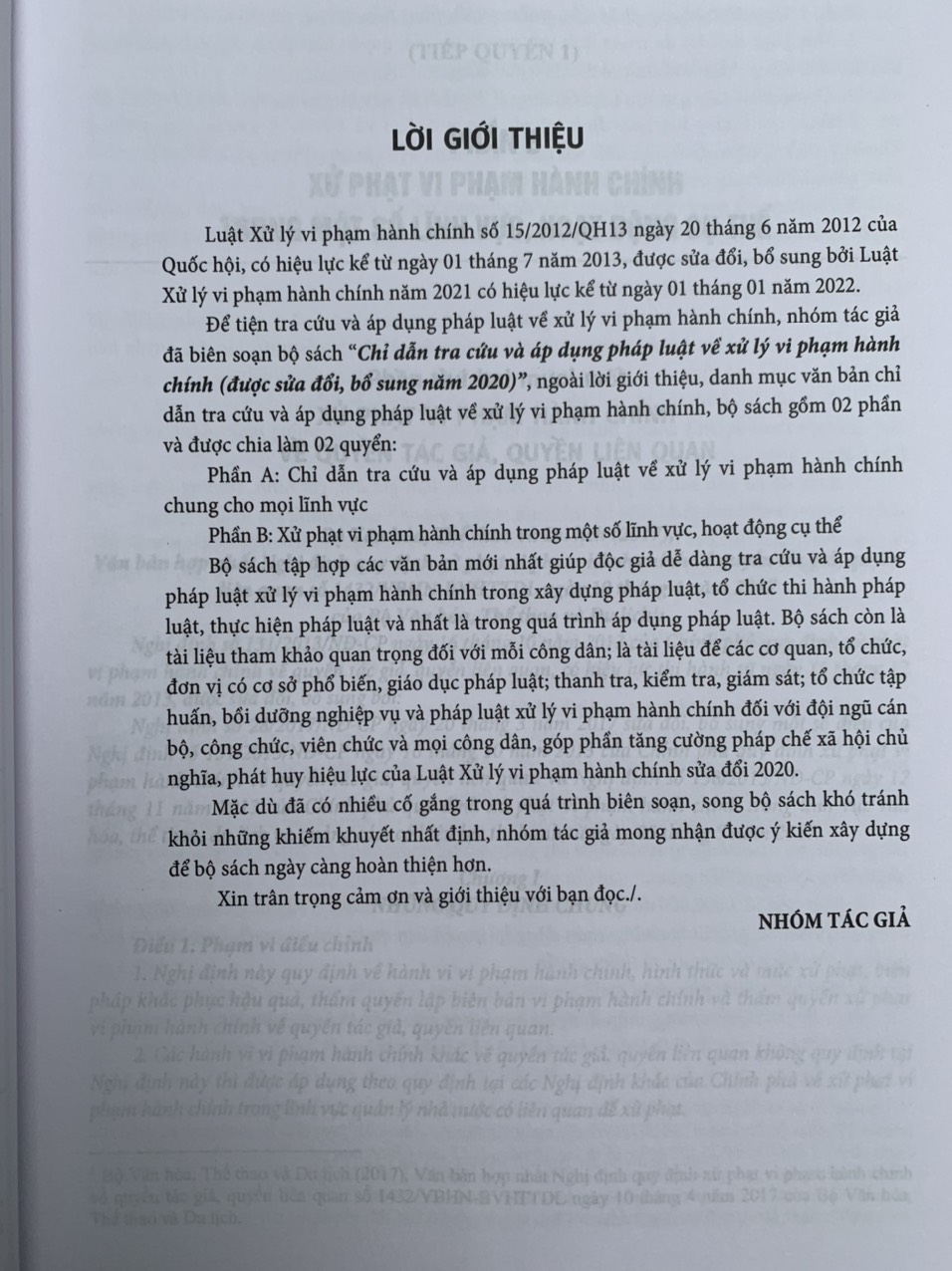 Để tiện tra cứu và áp dụng pháp luật về xử lý vi phạm hành chính, nhóm tác giả đã biên soạn bộ sách “Chỉ dẫn tra cứu và áp dụng pháp luật về xử lý vi phạm hành chính (được sửa đổi, bổ sung năm 2020)”, ngoài lời giới thiệu, danh mục văn bản chỉ dẫn tra cứu và áp dụng pháp luật về xử lý vi phạm hành chính, bộ sách gồm 02 phần và được chia làm 02 quyển: