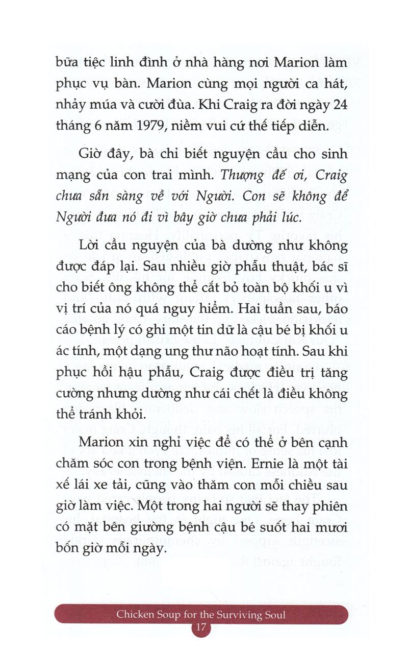 "Những câu chuyện mọi người vẫn kể cho nhau nghe thường có những ảnh hưởng tích cực đến họ… Đôi khi để tồn tại, chúng ta cần một câu chuyện khích lệ hơn là cần thức ăn." Barry Lopez Cuốn sách này bao gồm những câu chuyện mà chúng tôi tin rằng sẽ khuyến khích bạn nuôi dưỡng niềm hy vọng, nâng cao sức mạnh tinh thần giúp bạn chịu trách nhiệm với cuộc sống của chính mình và biết đứng dậy sau mỗi lần vấp ngã. Hơn thế nữa là sự động viên bạn sẵn sàng cho đi để đón nhận tình yêu vô điều kiện, thúc đẩy bạn đấu tranh và kiên trì đối mặt với những trở ngại tưởng chừng không thể vượt qua.
