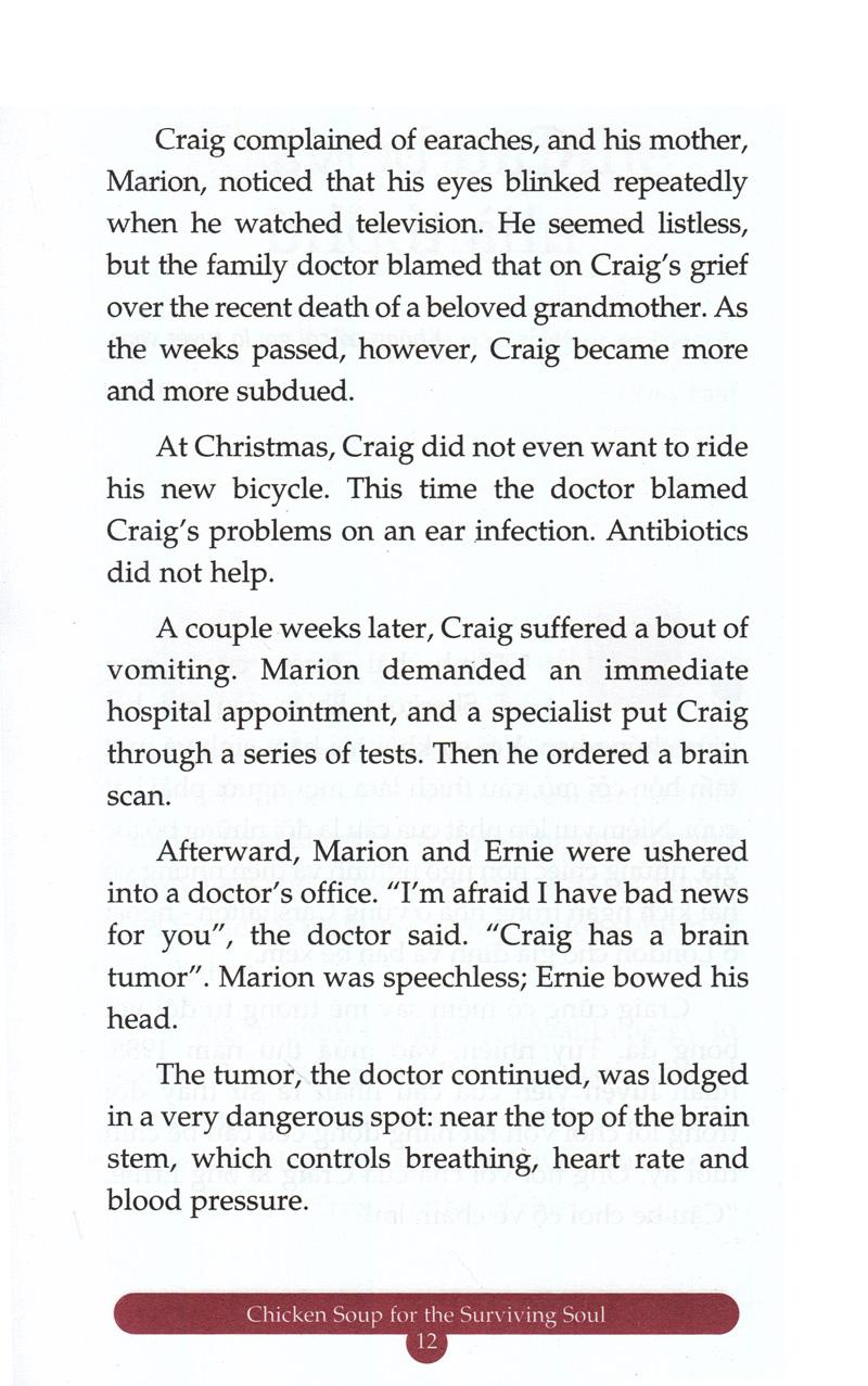 Câu chuyện về cô bé Searra mắc bệnh u não nhắc chúng ta nhớ rằng không nên hời hợt với những người mình yêu thương và phải nhìn nhận sâu sắc hơn những điều nông cạn chúng ta thường gặp trong cuộc số Còn nhiều những câu chuyện khác thật sự làm rung động bạn, mang đến động lực để bạn vượt những khó khăn của chính bản thân mình. Và kết thúc cuốn sách là câu chuyện về những cậu bé tình nguyện cạo trọc đầu để giúp người bạn bị ung thư không bị lạc lõng khi cậu bị rụng tóc do việc hóa trị.