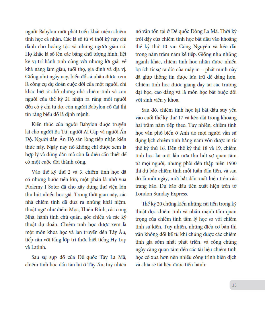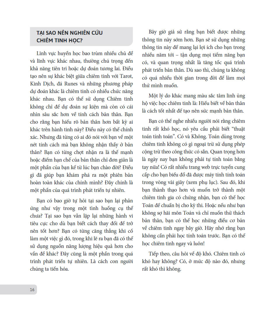 Khi bạn bóc tách từng lớp biểu đồ của bản thân, bạn sẽ phát hiện ra rất nhiều đặc điểm – mà bạn đã nhận thức lẫn chưa nhận thức – đã được định hình sẵn từ ngày bạn chào đời. Thông qua chiêm tinh, bạn sẽ hiểu bản thân hơn, xác định được những phẩm chất bạn tìm kiếm ở người bạn đời, nhận ra tiềm năng của bạn trong công việc và tài chính, cũng như phát triển kỹ năng giao tiếp và sức mạnh tiềm ẩn trong bạn, cùng nhiều vấn đề khác trong cuộc sống. Bạn sẽ thấy thích thú với một vài thông tin, cảm thấy muốn đào sâu tìm hiểu một số kiến thức, một số điều thì sẽ truyền cảm hứng, thúc đẩy bạn trở thành phiên bản tốt hơn của chính mình.