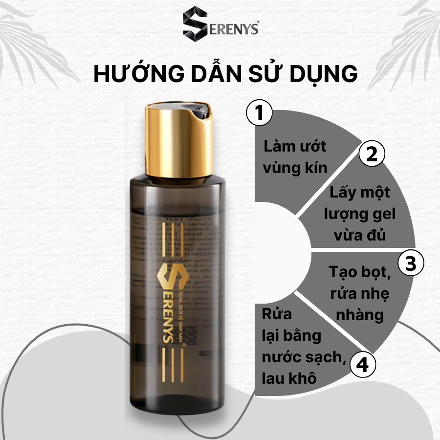 - Khôi phục và cân bằng độ ẩm, độ pH da. Sản phẩm không gây kích ứng da và không thấm qua da và niêm mạc. ĐỐI TƯỢNG SỬ DỤNG: Nam giới từ 12 tuổi trở lên CÁCH SỬ DỤNG Bước 1: Trước tiên, bạn dùng hai đầu ngón tay nhẹ nhàng tụt phần bao quy đầu xuống. Bước 2: Dùng nước để làm ướt vùng nhạy cảm và rửa sơ qua. Bước 3: Tiếp theo lấy 1 ít (khoảng 2-3 giọt gel Serenys), tạo bọt rồi thoa lên toàn bộ vùng nhạy cảm xoa nhẹ nhàng đừng quên làm sạch các nếp gấp. Bước 4: Cuối cùng rửa sạch lại với nước và lau khô nhẹ nhàng. Sử dụng hàng ngày để giữ vệ sinh vùng nhạy cảm. Lưu ý: Dung dịch rửa ngoài, không dùng sâu bên trong, không pha ngâm vùng nhạy cảm, không được uống. BẢO QUẢN