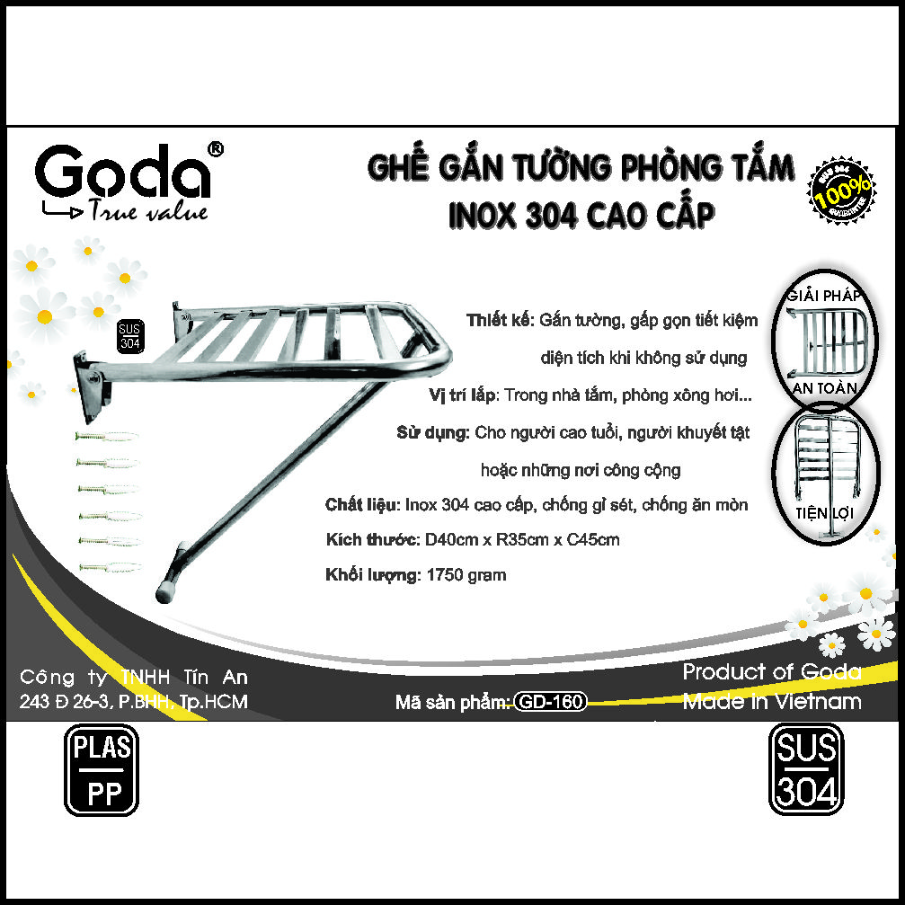 Mua tại TiktokGHẾ GẮN TƯỜNG GẤP GỌN INOX 304 GODA- là giải pháp tiện lợi và an toàn cho không gian phòng tắm, phòng xông hơi, đặc biệt phù hợp với người cao tuổi, người khuyết tật hoặc khu vực công cộng. Thiết kế gắn tường, gấp gọn, tiết kiệm diện tích khi không sử dụng. Chất liệu inox 304 cao cấp giúp chống gỉ sét, chịu lực tốt và khả năng chống trượt an toàn. THÔNG SỐ KỸ THUẬT