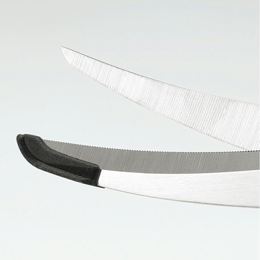 • Lưỡi kéo cong kết hợp hình lưỡi răng cưa thẳng giúp kéo cắt thực phẩm dễ dàng mà không bị trơn trượt.