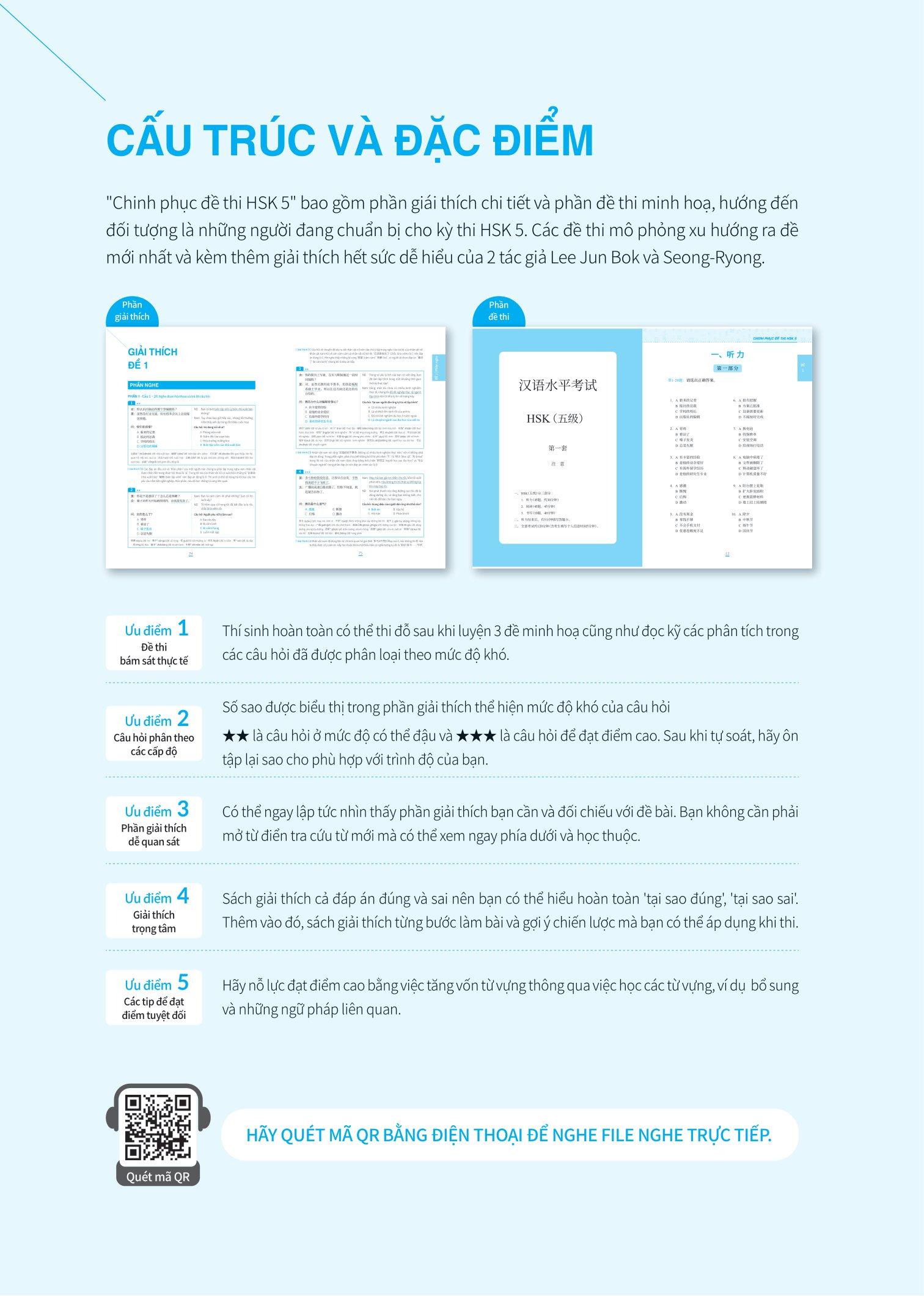 Cuốn sách "Chinh phục đề thi HSK 5" được tổng hợp với 3 bài thi thử, phân tích các câu hỏi được đưa ra trong bài thi HSK gần đây và chọn ra những câu hỏi trọng tâm. Bên cạnh đó cuốn sách cũng giải thích chi tiết các kiến thức cốt lõi trong các đề thi gần nhất với đề thi thật cũng như các câu hỏi học sinh dễ mắc lỗi.