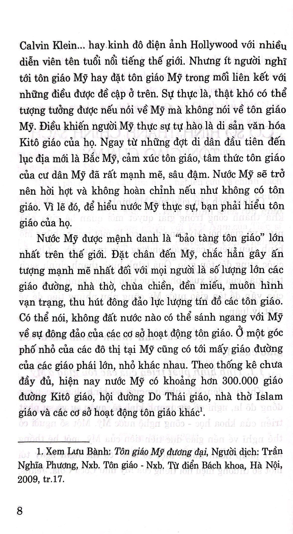 Tự do tôn giáo ở M.ỹ được xem như “tự do đầu tiên” của con người. Từ cái “tự do đầu tiên” đó, tôn giáo không chỉ len lỏi và tác động đến đời sống của đa số người M.ỹ mà còn trở thành một bộ phận quan trọng của toàn bộ nền kinh tế nước Mỹ. Tôn giáo chính là nền tảng tinh thần, đồng thời có đóng góp lớn cho kinh tế, văn hóa - xã hội. Sở dĩ nước Mỹ đã phát huy được nguồn lực, đóng góp đáng kể của tôn giáo cho phát triển xã hội, trước hết do đại bộ phận người M.ỹ là tín đồ tôn giáo, đồng thời họ rất chú trọng xây dựng chính sách tôn giáo phù hợp, đã tạo ra hành lang pháp lý rộng rãi cho các tổ chức tôn giáo hoạt động, đảm bảo tự do, bình đẳng tôn giáo, tránh sự tham dự của nhà nước vào hoạt động nội bộ của tôn giáo và ngược lại, nhưng lại phát huy cao độ tính năng động, tích cực của các tổ chức, hiệp hội, doanh nghiệp tôn giáo đóng góp cho xã hội.