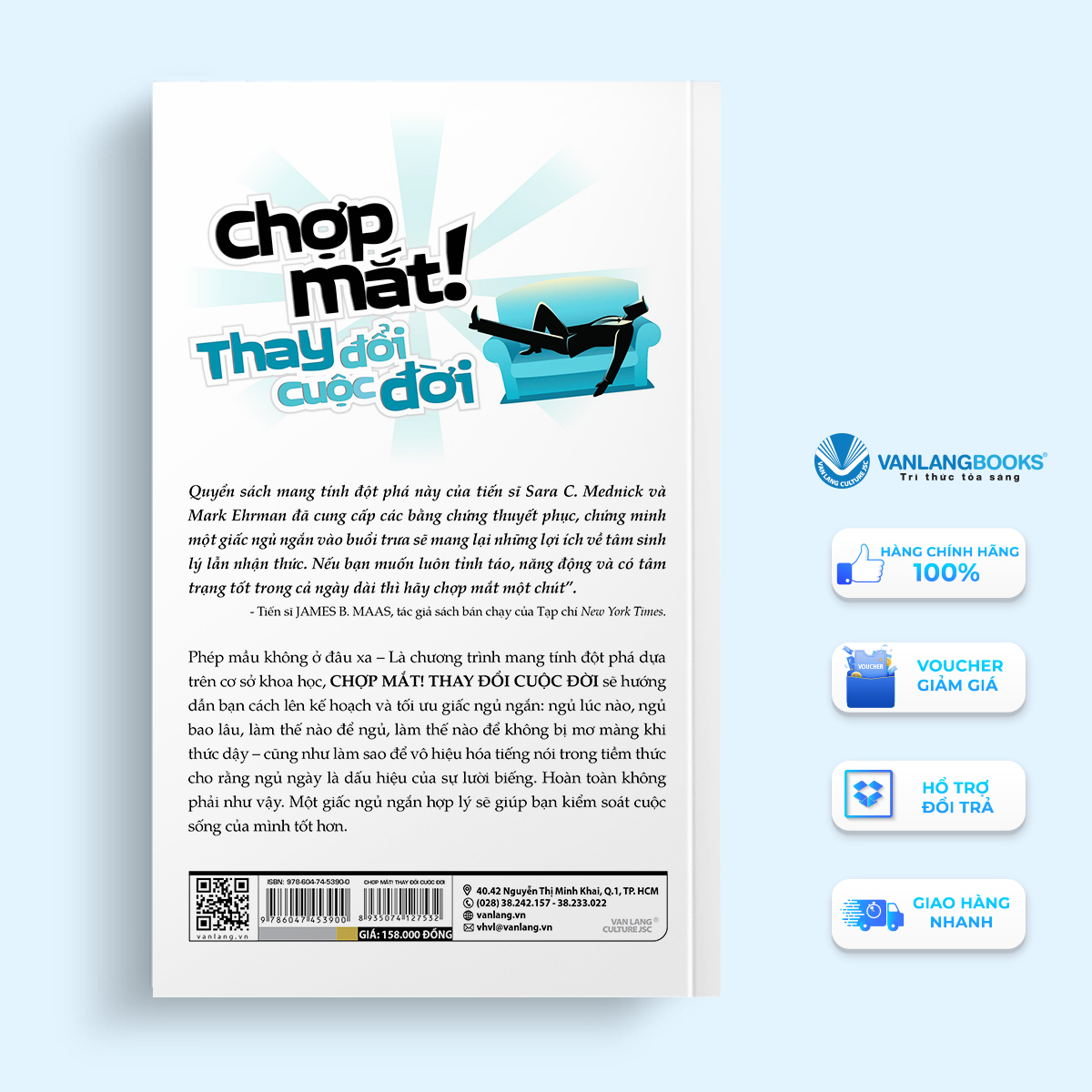 Chợp Mắt! Thay Đổi Cuộc Đời - Take A Nap! Change Your Life-Vanlangbooks I.Giới thiệu sách Quyển sách mang tính đột phá này của tiến sĩ Sara C. Mednick và Mark Ehrman đã cung cấp các bằng chứng thuyết phục, chứng minh một giấc ngủ ngắn vào buổi trưa sẽ mang lại những lợi ích về tâm sinh lý lẫn nhận thức. Nếu bạn muốn luôn tỉnh táo, năng động và có tâm trạng tốt trong cả ngày dài thì hãy chợp mắt một chút”.