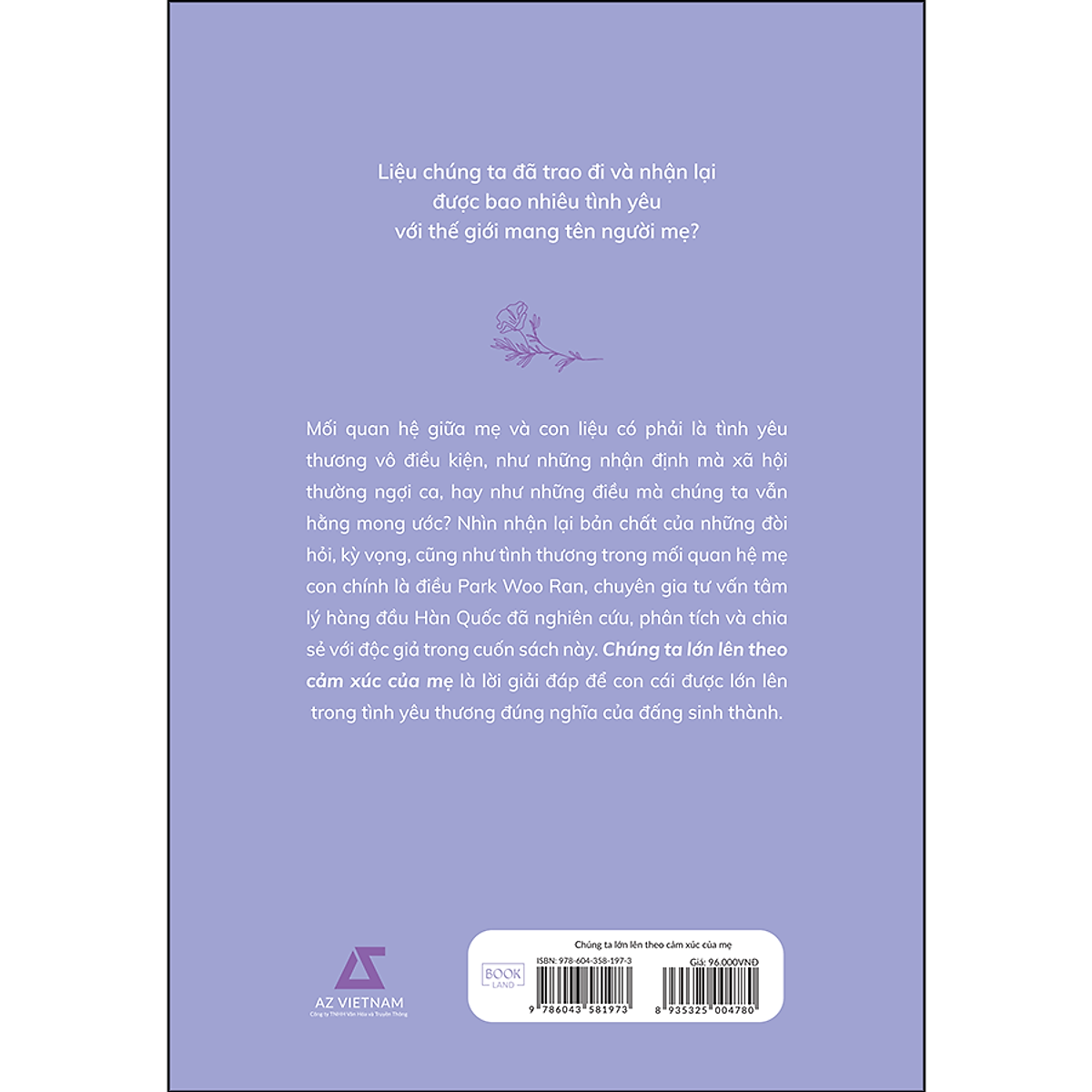 Liệu chúng ta đã trao đi và nhận lại được bao nhiêu tình yêu với thế giới mang tên người mẹ? Mối quan hệ giữa mẹ và con liệu có phải là tình yêu thương vô điều kiện như những nhận định mà xã hội thường ngợi ca, hay như những điều mà chúng ta vẫn hằng mong ước? Freud từng nói: “Con người là một thứ tồn tại mà ngay từ đầu đã không thể yêu thương người khác theo bản năng”. Chúng ta thường quản lý cuộc sống theo hướng làm bản thân hài lòng, điều này không có ngoại lệ cho dù đó có là quan hệ gia đình, hay mối quan hệ giữa mẹ và con cái. Nhìn nhận lại bản chất của những đòi hỏi, kỳ vọng, cũng như tình thương trong mối quan hệ mẹ con chính là điều Park Woo Ran - chuyên gia tư vấn tâm lý hàng đầu Hàn Quốc đã nghiên cứu, phân tích và chia sẻ với độc giả trong cuốn sách Chúng ta lớn lên theo cảm xúc của mẹ. 6 phần trong cuốn sách sẽ là lời giải đáp cho câu hỏi làm sao để con cái được lớn lên trong tình yêu thương đúng nghĩa của đấng sinh thành. Mục lục: Phần 1. Con gái lớn lên theo cảm xúc của mẹ Phần 2. Tôi có thực sự là mẹ của con mình không? Phần 3. Tôi cũng muốn trở thành một cô con gái đáng yêu của mẹ Phần 4. Những điều có được khi buông bỏ ảo tưởng cho rằng mẹ rất mạnh mẽ Phần 5. Mẹ chỉ cần là mẹ, bố cứ hãy là bố Phần 6. Cách sống như một con người vượt qua cả mẹ