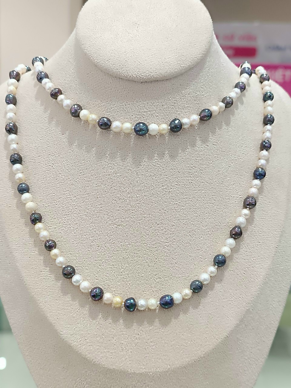 Chuỗi Ngọc trai Akoya mix màu ngọc trắng và ngọc đen ánh tím là một sản phẩm độc đáo, tinh tế và sang trọng, mang đến sự kết hợp hoàn hảo giữa vẻ đẹp tinh khiết của ngọc trắng và sự quý phái, bí ẩn của ngọc đen ánh tím.