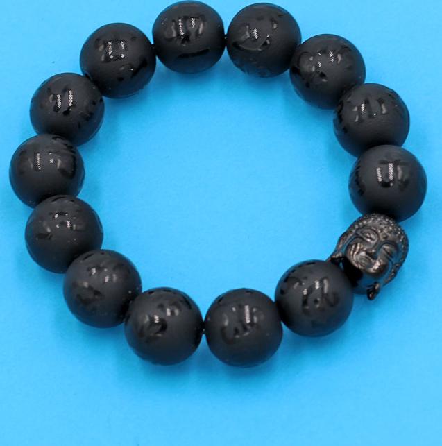 ✨Chuỗi tay thạch anh đen Phật Chú khắc mờ 14 ly - cẩn hạt Như Lai inox đen VTEPCMNLE14 - hợp mệnh Thủy, mệnh Mộc