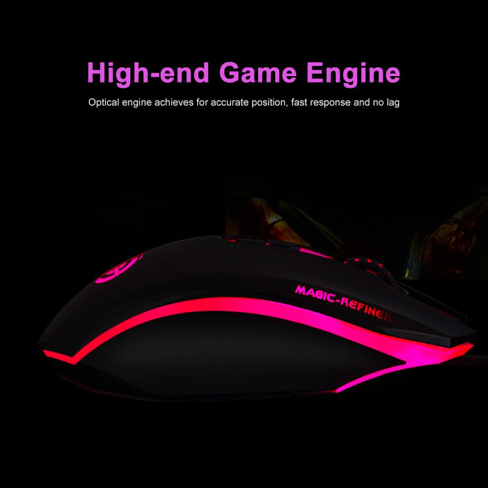 High performance with special e-sports chip, cool light effect, four gears DPI settings, add metal chassis and 3D anti-skid roller. Features: High-end Game Engine Optical engine achieves for accurate position, fast response and no lag.