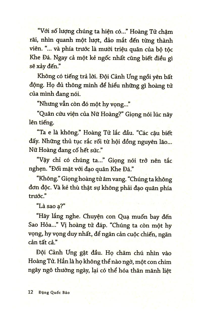 Như cuộc rong chơi, bạn đọc sẽ tìm thấy chính mình trong câu chuyện của một chú quạ, thấy những người quen của mình qua các cư dân của Vương Quốc, rồi sẽ tự khám phá bản thân và chinh phục được thính giả bằng kỹ năng trình bày. Đó là cách mà tác giả Đặng Quốc Bảo - nguyên chủ tịch câu lạc bộ diễn thuyết Sài Gòn - kỳ vọng ở bộ sách này, và đó chính xác là điều anh đem đến cho độc giả. Một bộ sách hướng dẫn kỹ năng cho người trẻ theo phong cách mới mẻ.