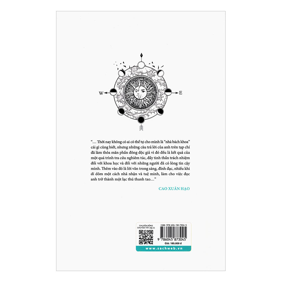 Mua tại TiktokChuyện Đông Chuyện Tây (Tập 2) “…Thời nay không có ai có thể tự cho mình là “nhà bách khoa” cái gì cũng biết, nhưng những câu trả lời của anh trên tạp chí đã làm thỏa mãn phần đông độc giả vì đó đều là kết quả của một quá trình tra cứu nghiêm túc, đầy tinh thần trách nhiệm đối với khoa học và đối với những người đã có lòng tin cậy mình. Thêm vào đó là lời văn trong sáng, đĩnh đạc, nhiều khi dí dỏm một cách nhã nhặn và tuệ minh, làm cho việc đọc anh trở thành một lạc thú thanh tao…” - Cao Xuân Hạo