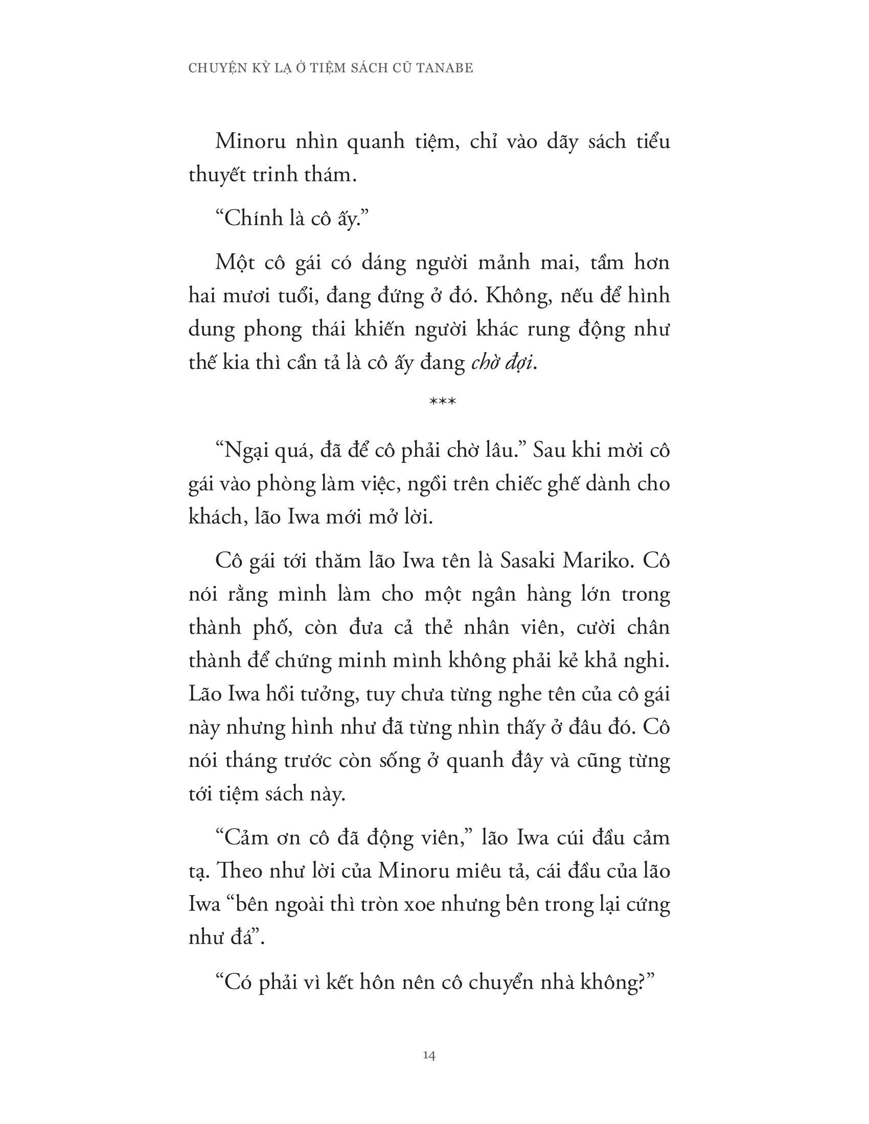 Cuốn sách là một tuyển tập những câu truyện “trinh thám” ngắn liên quan đến hành trình phá án hay đi tìm câu trả lời cho những bí ẩn hay “vụ án” xuất phát hoặc liên quan đến tiệm sách Tanabe nơi lão Iwa làm chủ. Trong suốt những hành trình nhỏ ấy, cả lão Iwa và đứa cháu Minoru của m.ình đã cho độc giả thấy lần lượt từng lớp lang bản chất con người (cả tiêu cực lẫn tích cực) cũng như mối quan hệ và tình cảm gia đình được thể hiện khéo léo qua những tương tác của hai ông cháu.
