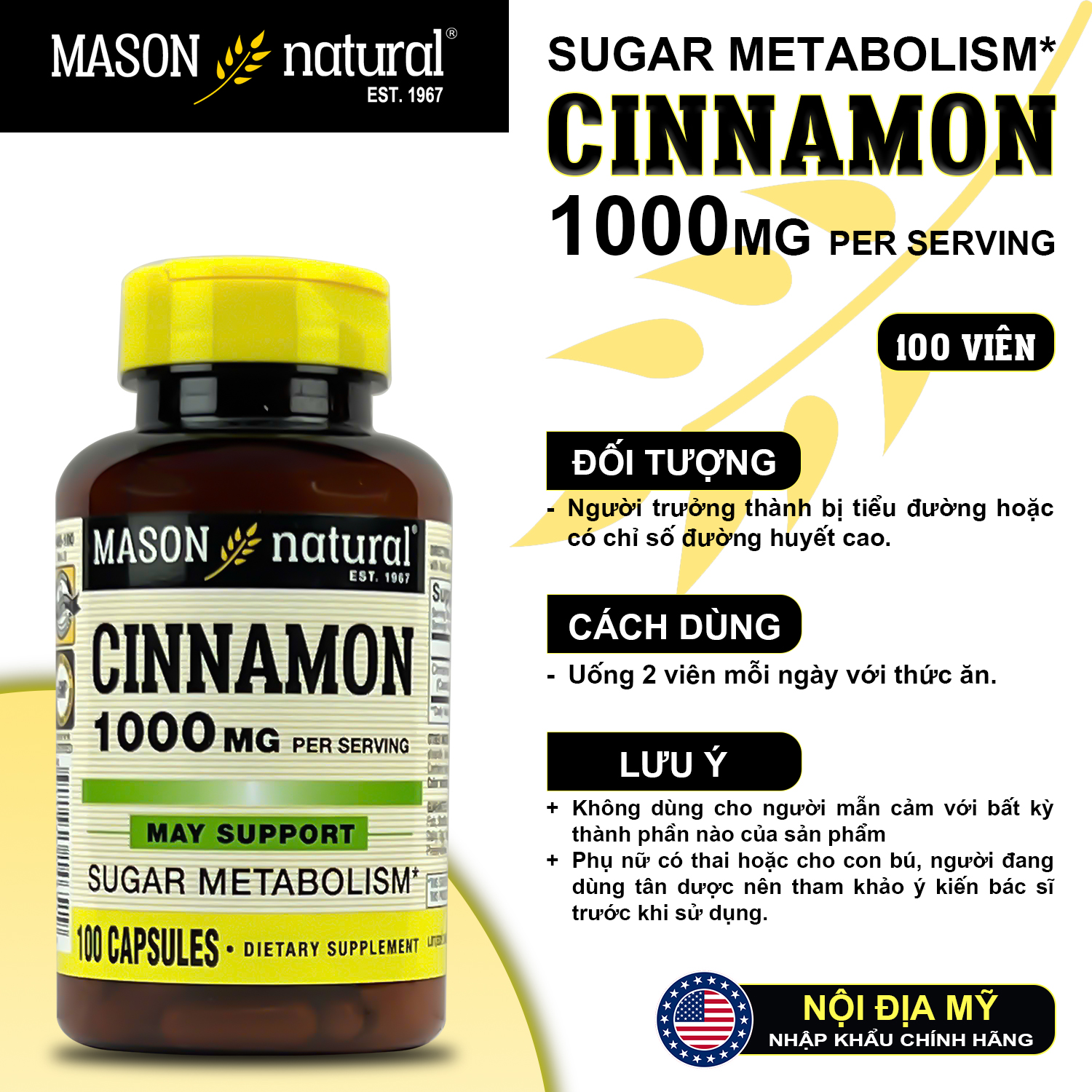 MASON CINNAMON 1000MG - ỔN ĐỊNH ĐƯỜNG HUYẾT TỰ NHIÊN - SỐNG KHỎE MỖI NGÀY! Chiết xuất quế nguyên chất 1000mg - Hỗ trợ kiểm soát đường huyết - An toàn cho sức khỏe Mason