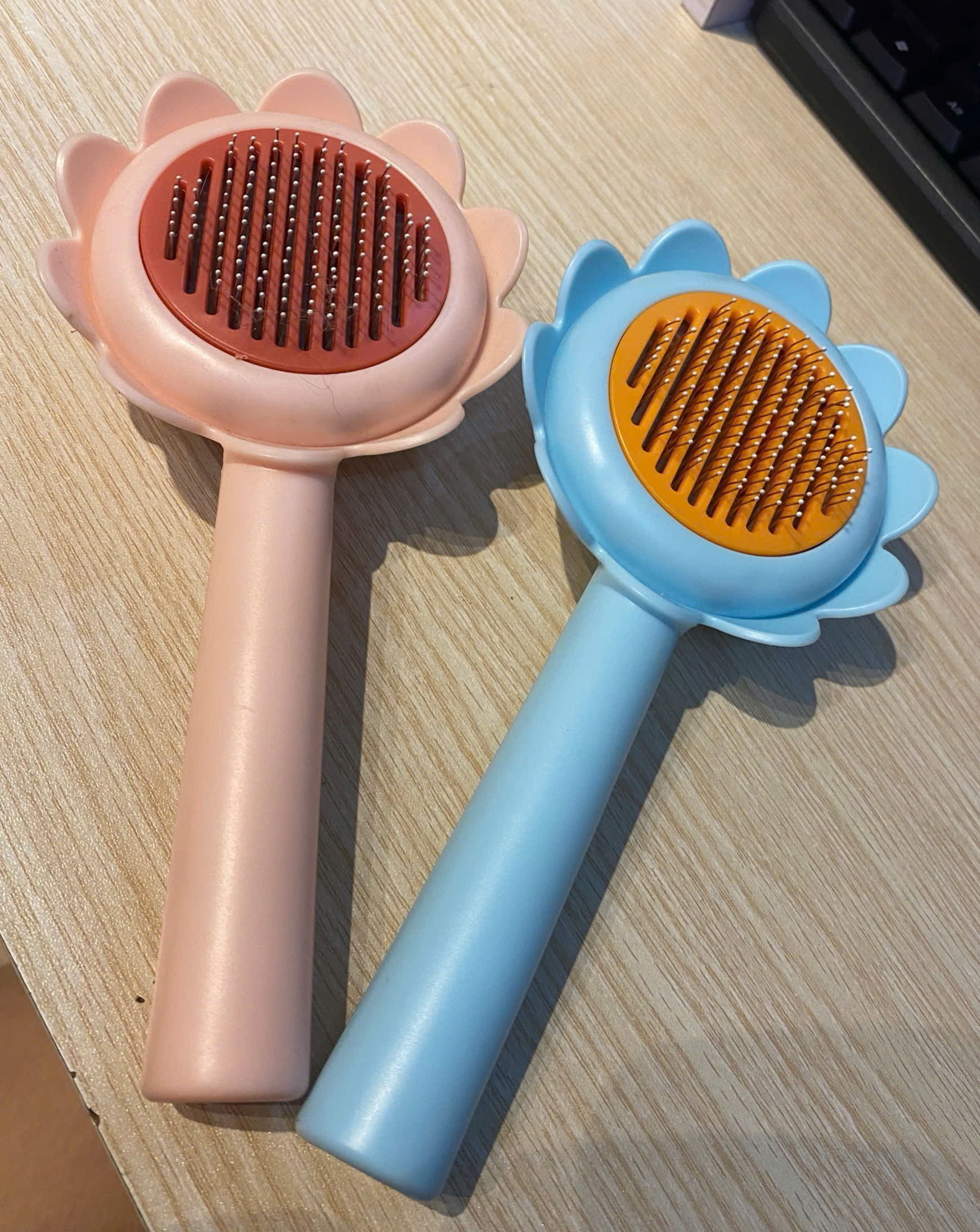 Lược chải lông rụng dành cho chó mèo có nút bấm hình hoa dễ thương Tay cầm thoải mái trên lược cho thú cưng này giúp cầm thoải mái. Nó có thiết kế có