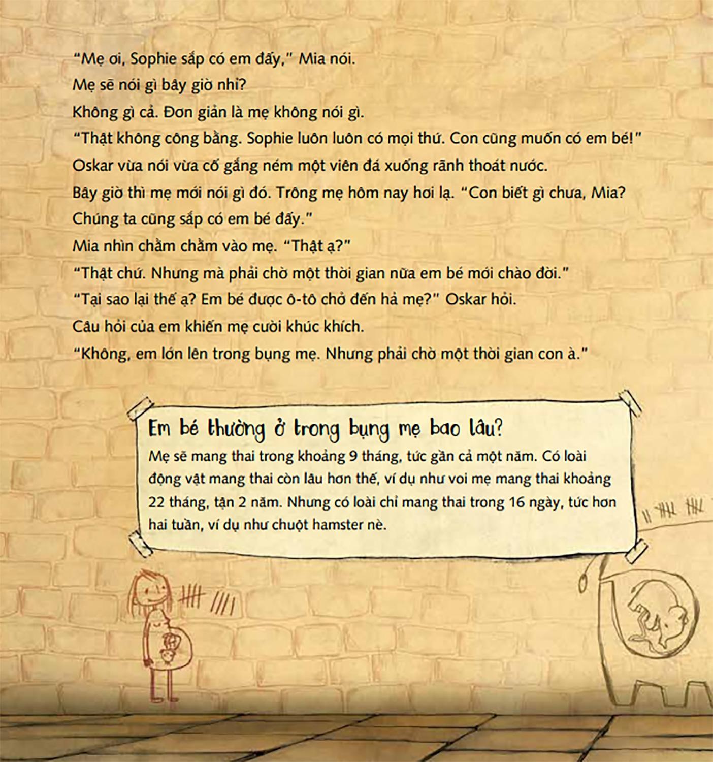 Cũng như những thắc mắc của Mia và Oskar trong cuốn sách này. Mia và Oskar sắp có em. Những điều đang diễn ra trong bụng mẹ thật là thú vị, không thể tin được luôn. Làm thế nào mà một em bé lại ở trong bụng của mẹ được? Thức ăn mà mẹ ăn có rơi vào đầu em không nhỉ?
