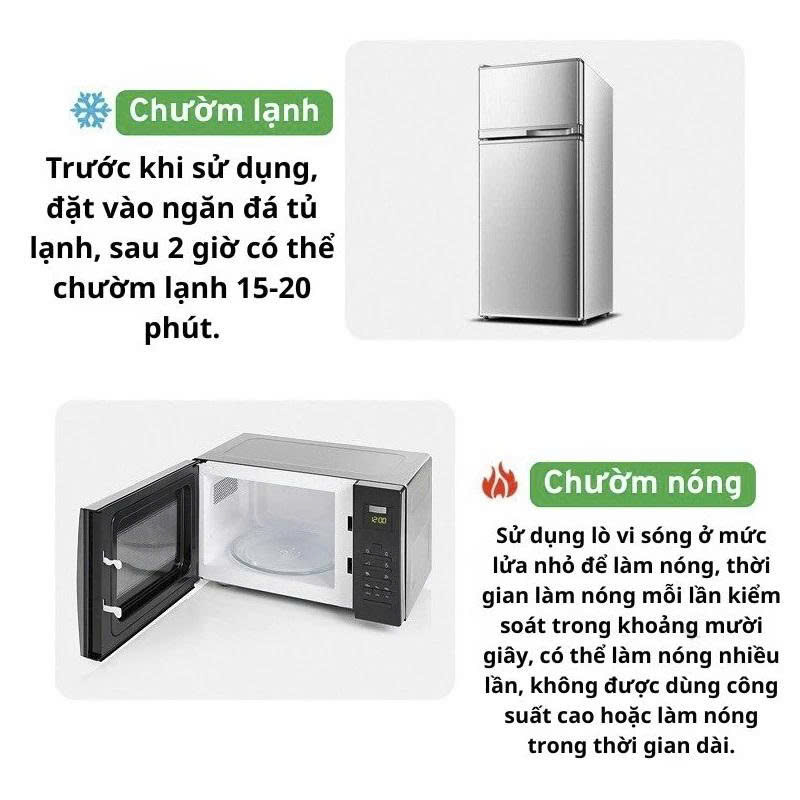 •  Ngưng sử dụng ít nhất 2h nếu muốn chườm tiếp.  Có thể chườm nhiều lần trong ngày.  Rửa qua nước sạch sau khi sử dụng.  Bảo quản nơi thoáng mát, hoặc nhăn đá tủ lạnh (khi cần lấy ra dùng luôn)