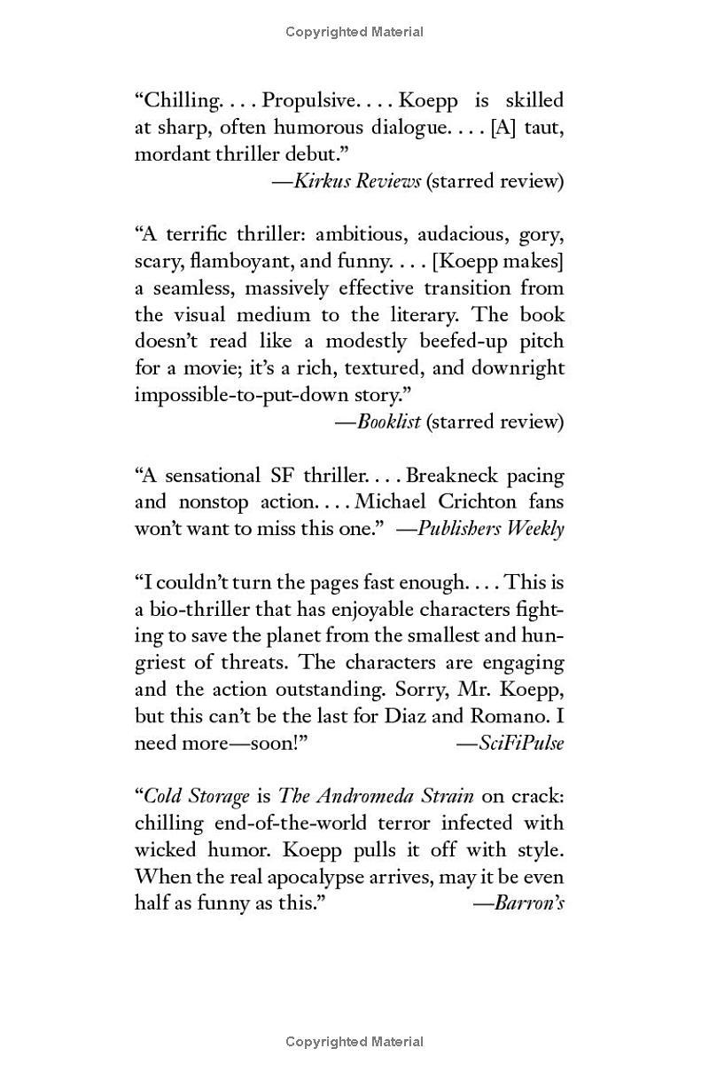 For fans of The Martian, Dark Matter, and Before the Fall comes an astonishing debut thriller by the screenwriter of Jurassic Park: a wild and terrifying bioterrorism adventure about three strangers who must work together to contain a highly contagious, deadly organism that could destroy all of humanity.