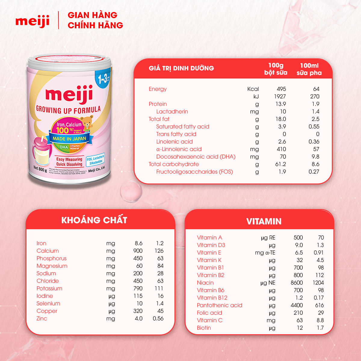 - Meiji Growing Up Formula là sản phẩm dạng bột, đóng gói hộp thiếc nắp nhôm, trọng lượng 800g. ĐẶC ĐIỂM SẢN PHẨM