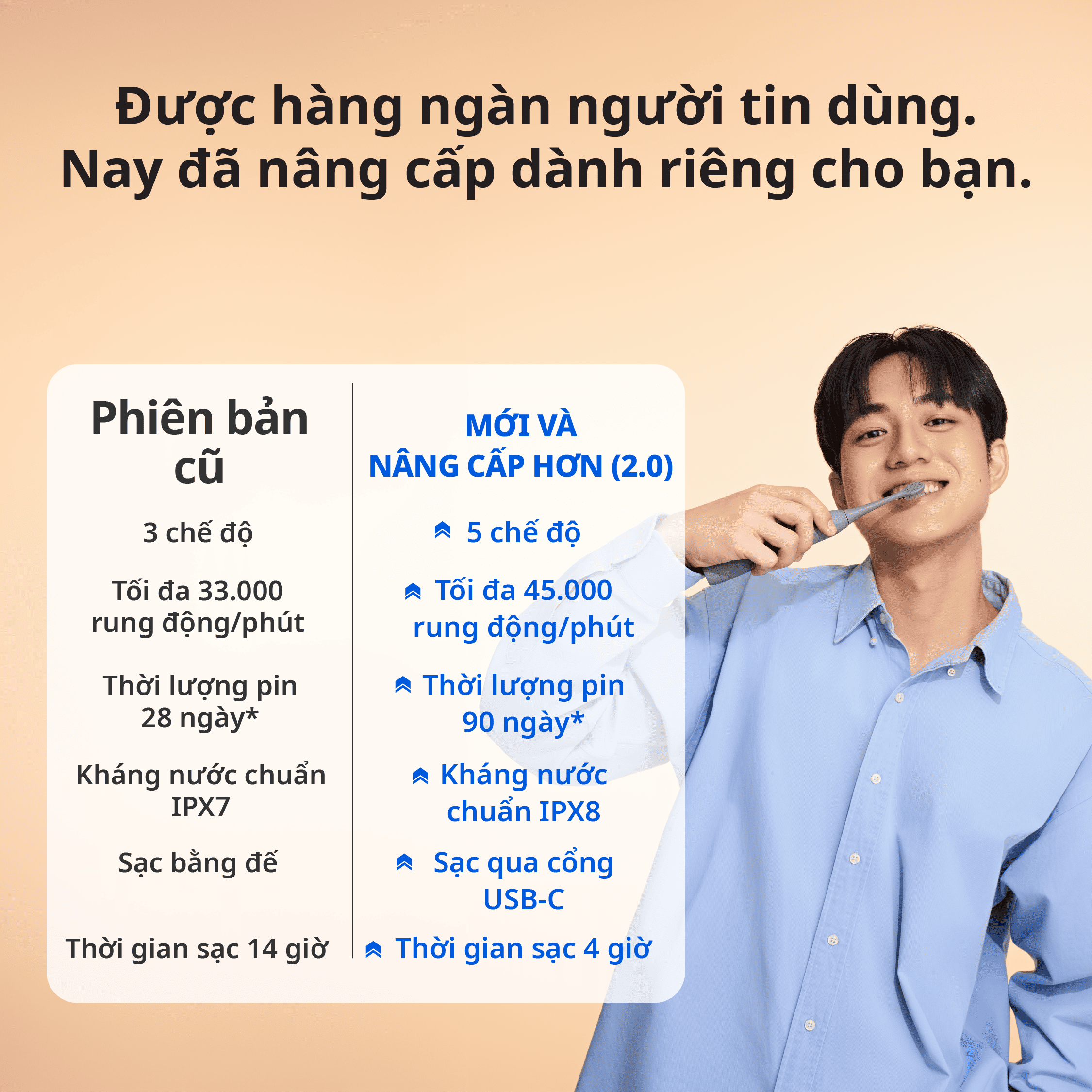 THÔNG SỐ SẢN PHẨM Pin: 2500 mAh pin Lithium-ion, có thể sạc lại (sử dụng được 30 ngày, 2 phút/ lần/ ngày để tốt cho răng nướu, thời gian sử dụng sẽ phụ thuộc